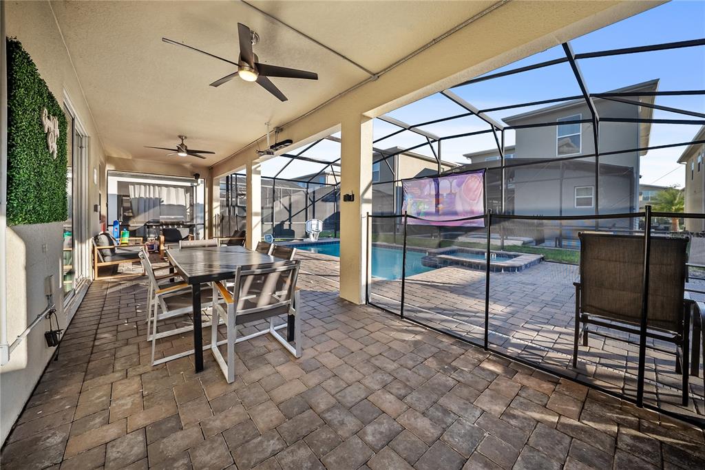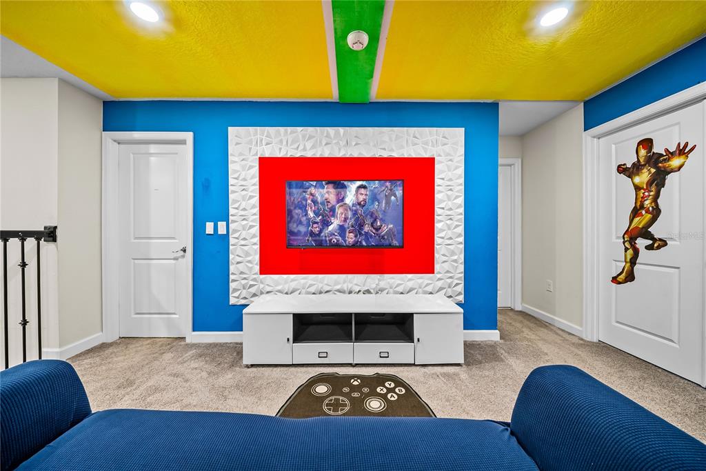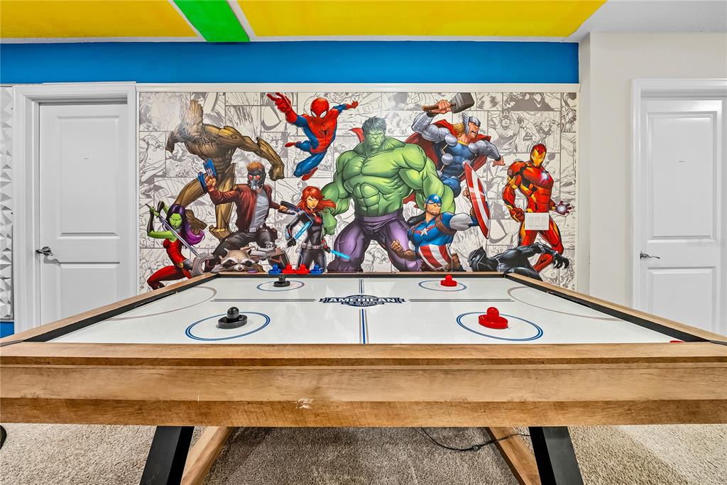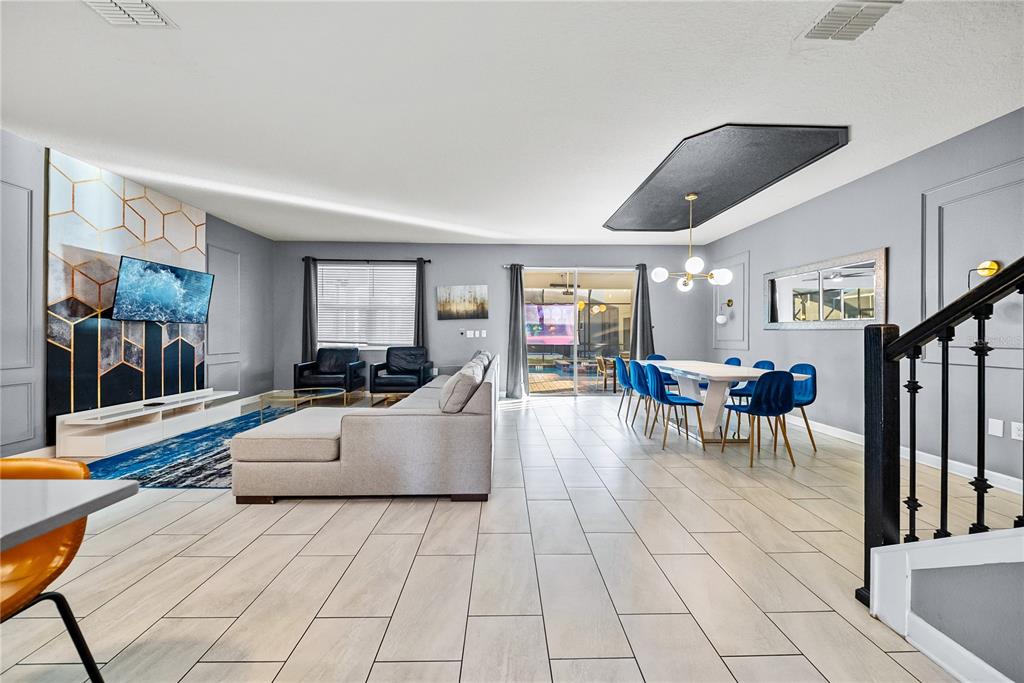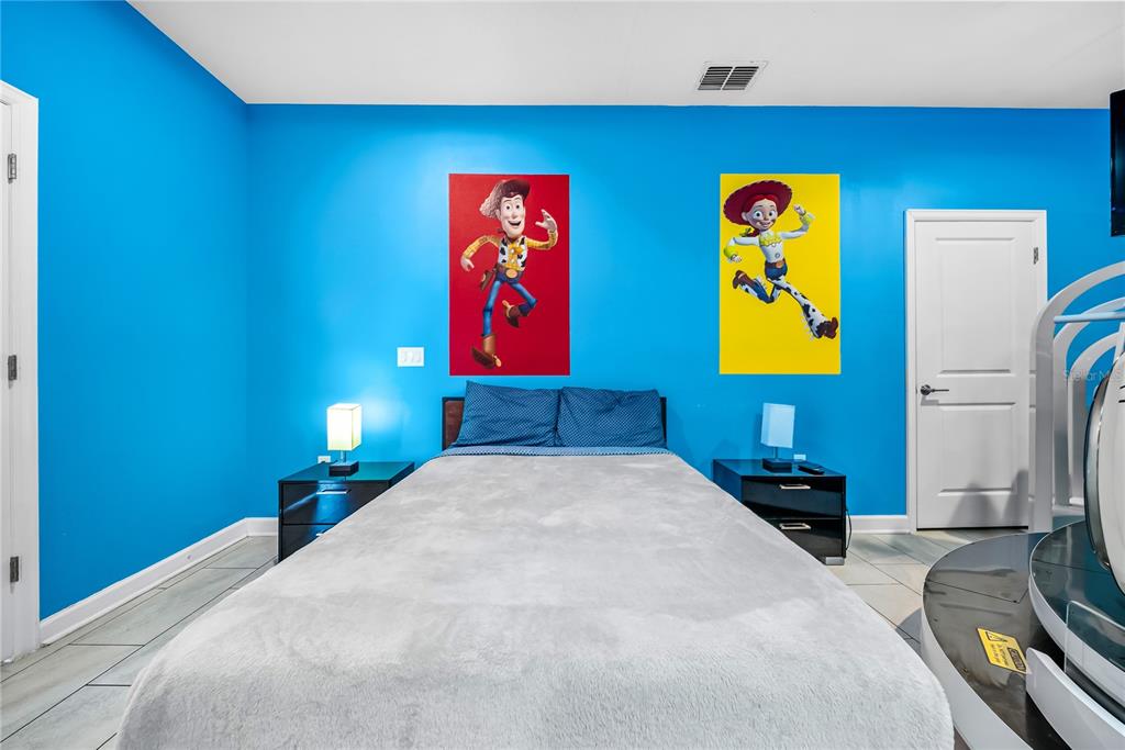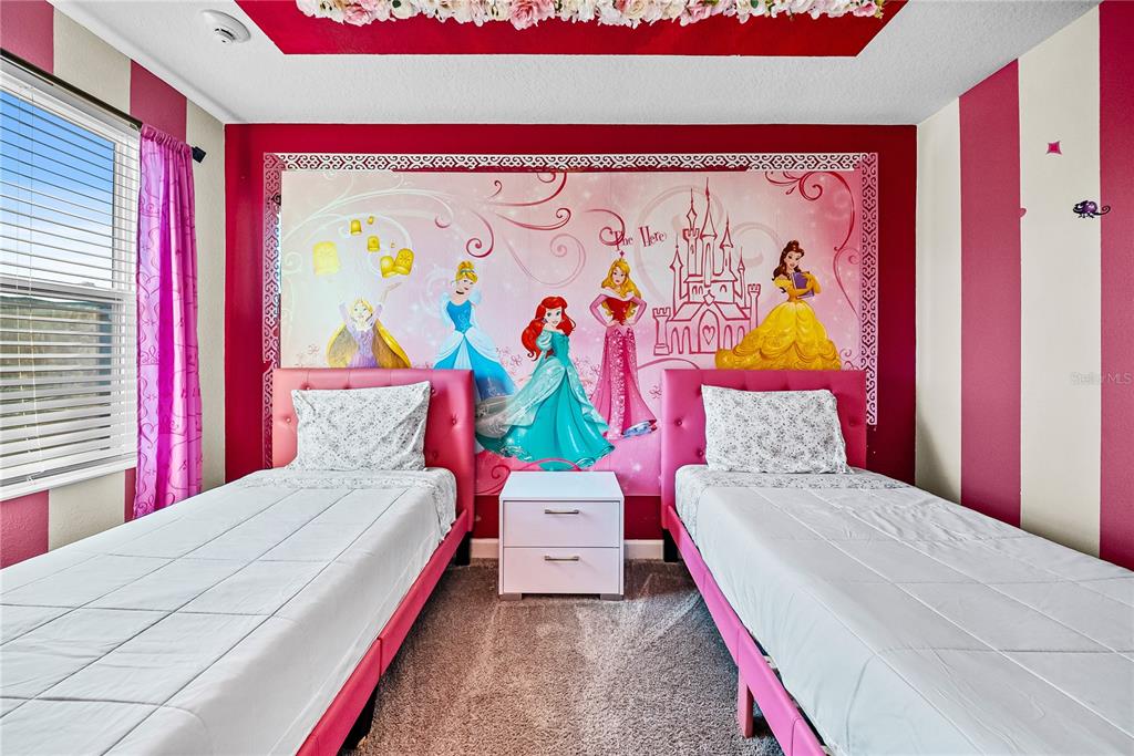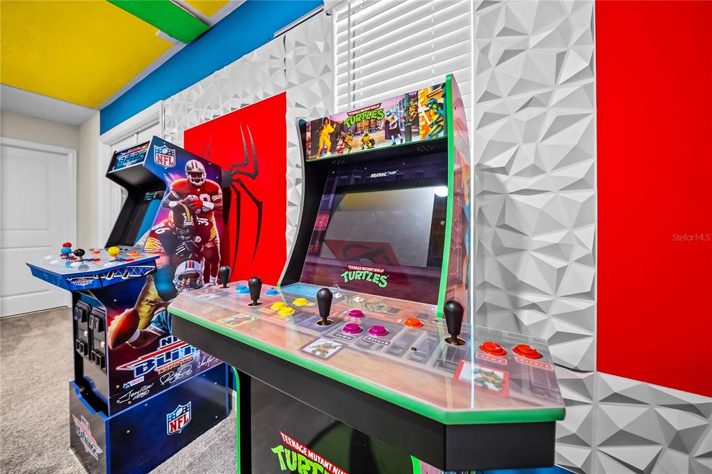 Spectacular 8-bedroom, 5-bath vacation home located in the highly desirable Storey Lake Resort, offering an unbeatable location near Orlando’s major attractions, shopping, and dining. This sought-after Santiago model, the largest and most popular floor plan in the community, is a proven income-producing property and is being sold fully furnished and turn-key. The home features a well-balanced and functional layout designed to comfortably accommodate large groups, making it ideal for multi-generational stays or short-term rental use. The first floor welcomes you with an inviting foyer and includes a full bedroom, a spacious kitchen with large breakfast bar and pantry, and open living and dining areas enhanced by modern finishes and quartz countertops throughout. Sliding glass doors lead to a covered patio and screened private pool, creating seamless indoor-outdoor living. The main level also includes a custom themed game room equipped with a VR machine, while upstairs you’ll find a spacious loft/media area, additional themed spaces, and a conveniently located laundry room. The second level features the remaining bedrooms and bathrooms, offering ample privacy for guests. A private movie theater and thoughtfully designed themed bedrooms further elevate the guest experience and rental appeal. Storey Lake Resort offers exceptional amenities, including a resort-style clubhouse, fitness center, water park with slides and lazy river, tiki bar, playgrounds, and basketball, volleyball, and tennis courts. Located approximately 4 miles from Walt Disney World and minutes from Universal Studios, SeaWorld, and major highways, this property delivers both lifestyle and investment potential. Property management information and rental financials available upon request. An excellent opportunity for investors or buyers seeking a high-performing vacation rental in one of Central Florida’s most sought-after communities.