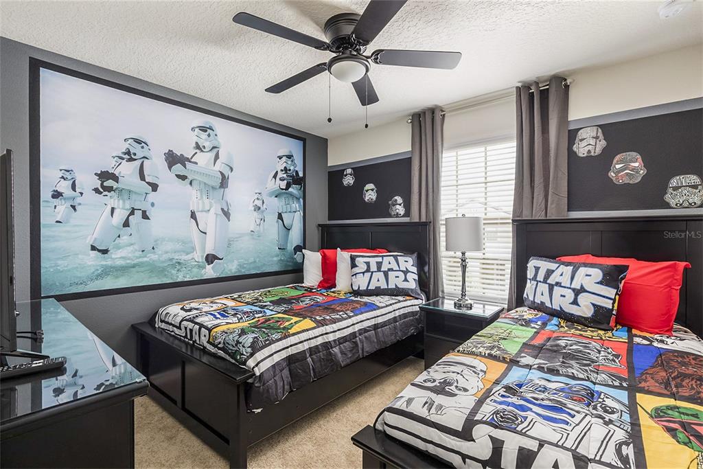 The home features three king-sized bedrooms, a Star Wars-themed room with a twin and full bed, and a Mickey Mouse-themed bunk room with a twin-over-full setup—sure to delight guests of all ages.