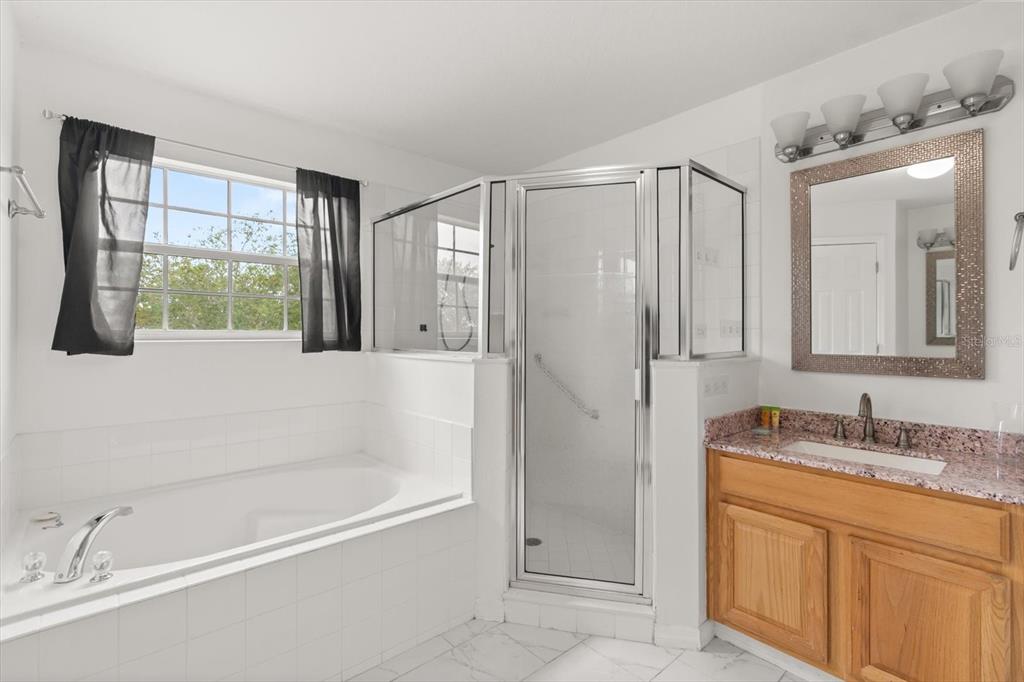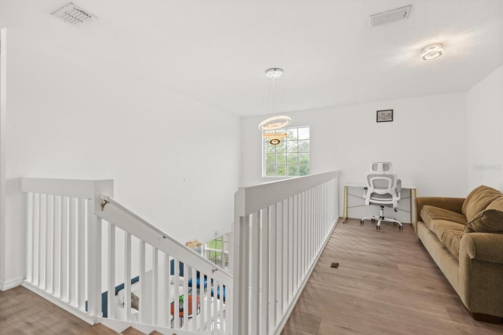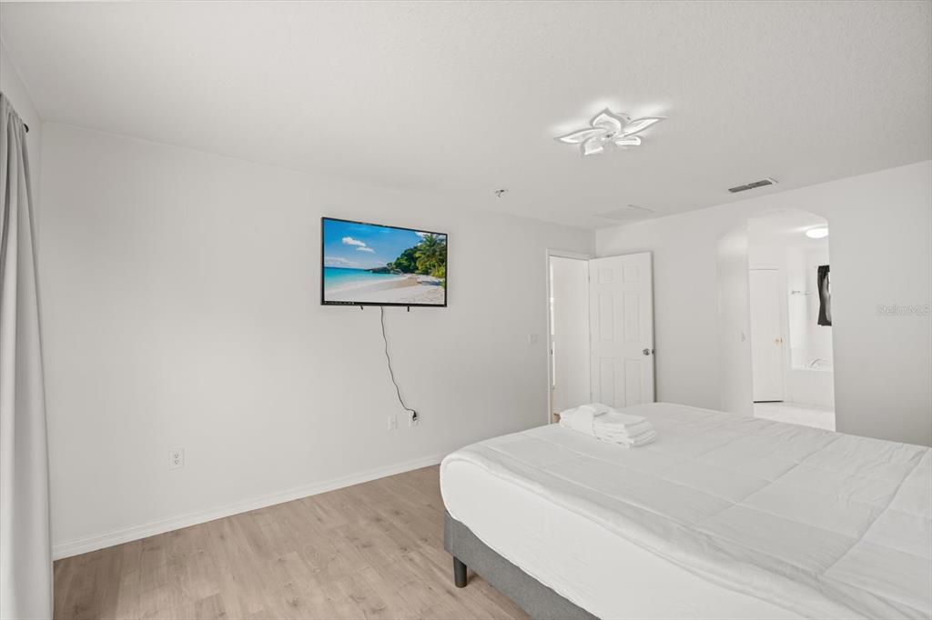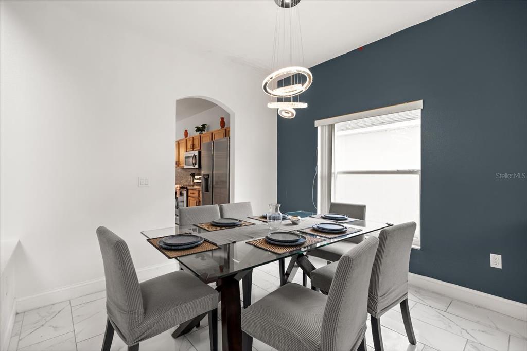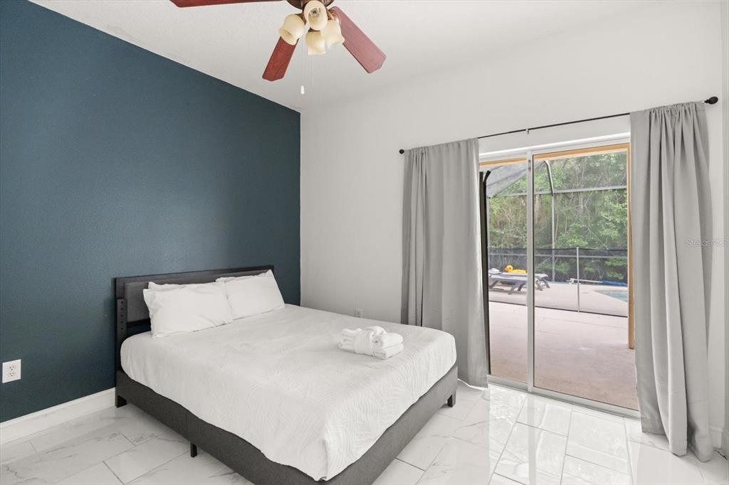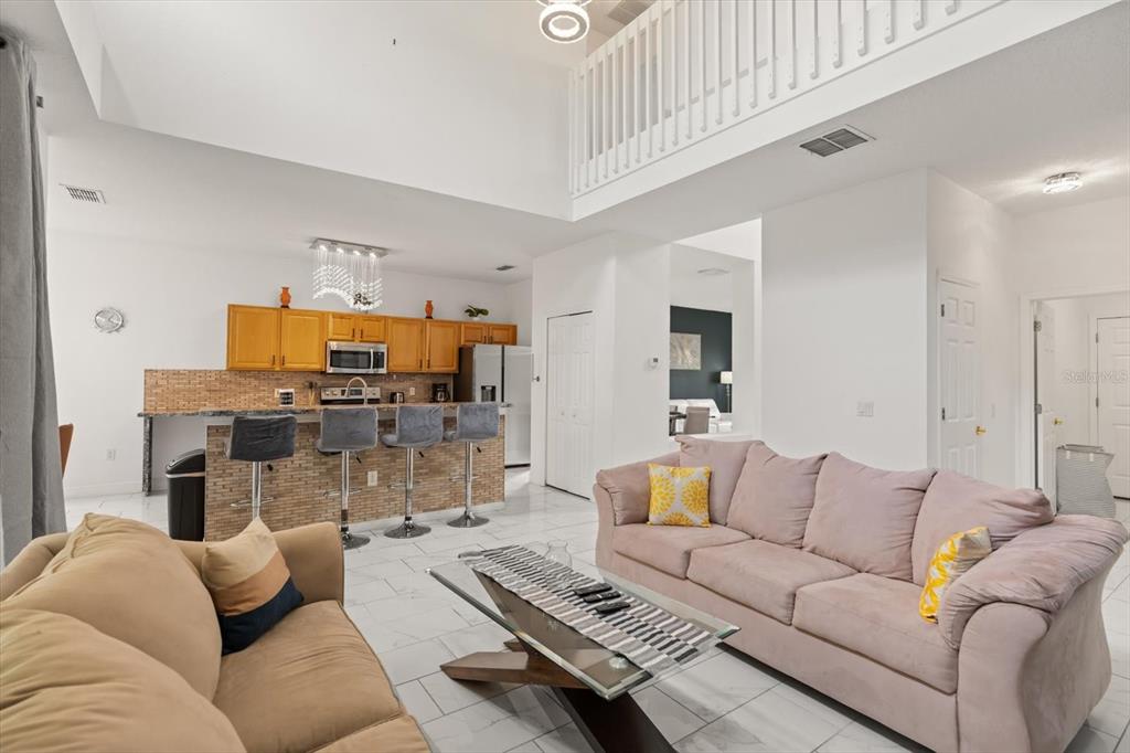 Beautiful 5-bedroom, 3 full and 2 half bathroom home with over 2,500 sq ft of living space, ideal for short-term rental or primary residence. Features include a spacious open floor plan with high ceilings and formal living and dining areas, a large great room with high ceilings and beautiful fixtures, and a bright kitchen with new refrigerator, ample cabinetry, and eat-in space. The oversized primary suite offers dual walk-in closets and a bathroom with dual sinks, garden tub, and separate shower. Additional highlights include newer tile flooring,master suite balcony over looking pool and conservation, upgraded bathrooms, 2017 A/C, loft area perfect for office or flex space, and a converted garage game room. Enjoy a private pool with large lanai, perfect for outdoor living. Low HOA of $175/month and no CDD. Conveniently located near major attractions, shopping, and 15 minutes from Disney. Short Term Rental allowed.