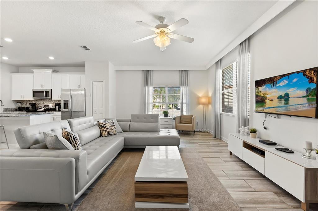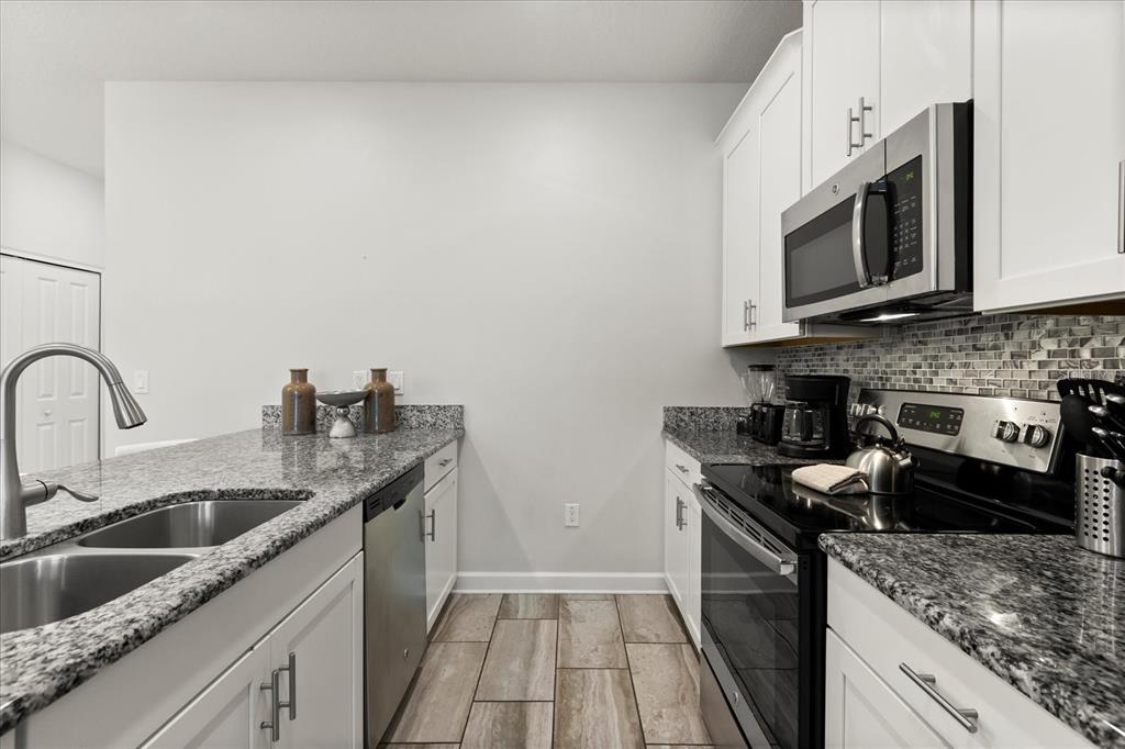 Step into an open-concept layout perfect for families or groups, featuring ceramic tile in main areas, plush carpeting in bedrooms and modern amenities. The gourmet kitchen boasts stainless steel appliances including dishwasher, range, microwave, refrigerator, disposal, washer, dryer, and electric water heater, with stone counters and solid wood cabinets for effortless entertaining.