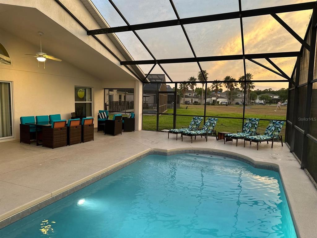 Beautiful 4 bedroom/3 bathroom pool home featuring an extended private pool deck with views across the community grounds, a double garage and an extended driveway. This lovely home comes fully furnished and ready to go. The roof was replaced 2020, A/C 2021, pool heater 2021 and the pool was resurfaced 2022. It has updated floors, an open-plan living space with a lounge, formal dining area, kitchen, four bedrooms, three bathrooms, games room in the garage and a large private pool deck. The attractive family room has a vaulted ceiling, sofas, ceiling fan and sliding doors out to the pool deck. The updated kitchen has granite counters and comes with everything you need for at-home dining including newer stainless-steel appliances – fridge freezer, dishwasher, stove, microwave, plus coffee maker, cooking utensils, crockery etc. The kitchen island has bar stools, and the formal dining area seats six guests. Step through to the primary bedroom suite with a ceiling fan and sliding doors leading out to the pool. This bedroom has a spacious en suite bathroom complete with two vanity sink areas, a tub, a separate shower, WC and two walk-in closets. Bedroom 2 is an attractive queen room with a ceiling fan and bathroom right next door with tub/shower, WC and sink vanity. At the front of the home, bedrooms 3 and 4 are twin rooms and share a Jack-and-Jill bathroom with tub/shower. The screened-in pool deck has a spacious shaded seating/dining area with ceiling fan, loungers, child safety fence and views over the lovely pool and out to the community grounds with a play area. The garage has been converted into a games room with pool table and table football. There is also a laundry closet with a washer, dryer and ironing equipment. At the front of this single-level home is an extended private driveway. The home is being sold As Is with all furniture, appliances, linen, kitchen items etc included. It will make the ideal home for long-term residents, as a vacation home or as a short-term rental property. The popular Cumbrian Lakes community is in a convenient location 10 miles from Disney World.