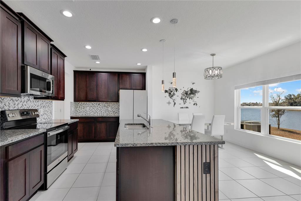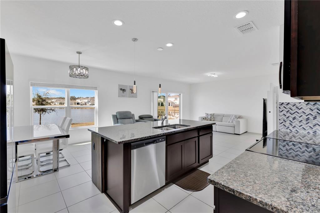 The main living area features an open-concept design connecting the living room, dining area, and kitchen, allowing for natural light and efficient flow throughout the space. The kitchen serves as the center of the home with ample counter space and storage suitable for daily use and gatherings with stunning lake views.
