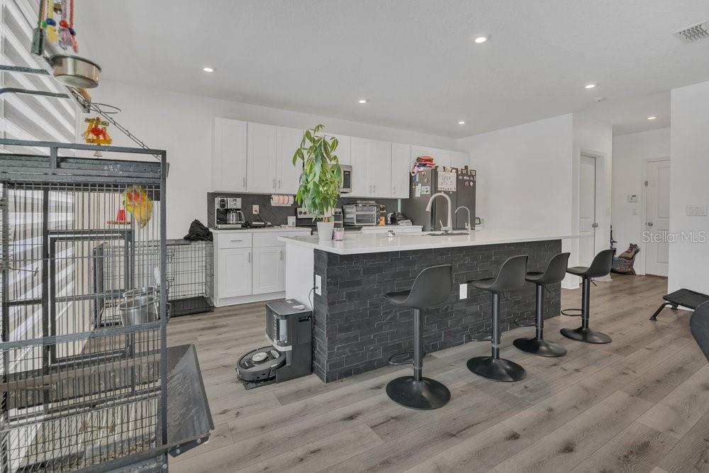 Featuring 5 spacious bedrooms and 3 full bathrooms, this home provides a flexible layout ideal for families of all sizes. The open-concept design defines the first floor, with a modern kitchen on one end, a bright living area on the other, and an informal dining space in the center. From there, sliding glass doors lead to the extended covered lanai, perfect for outdoor dining or relaxing under the Florida sun.