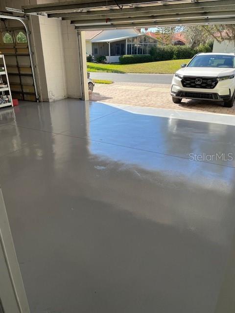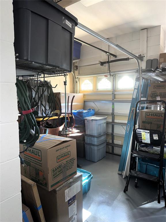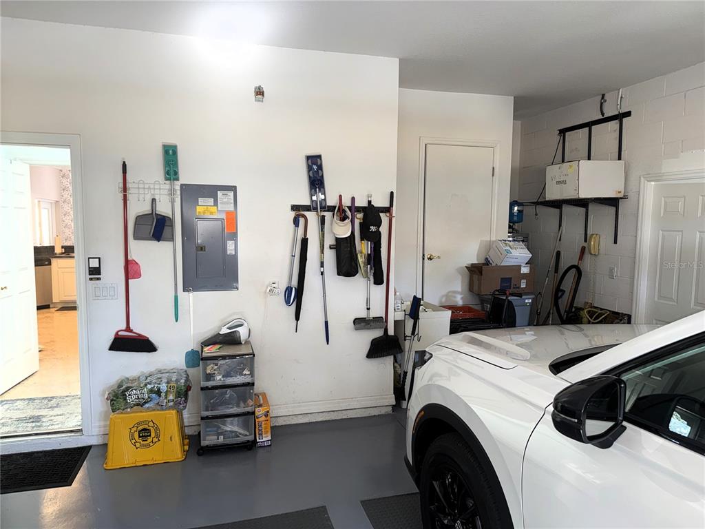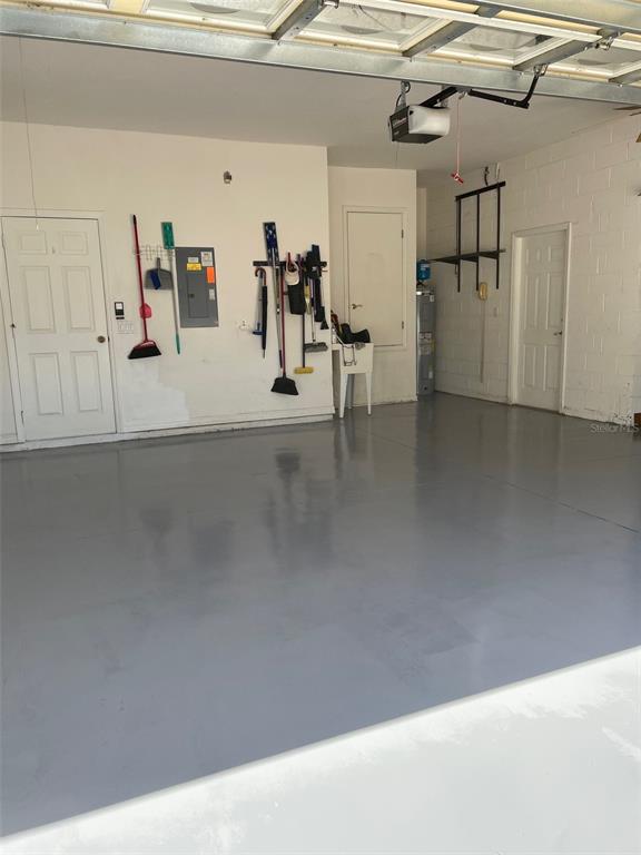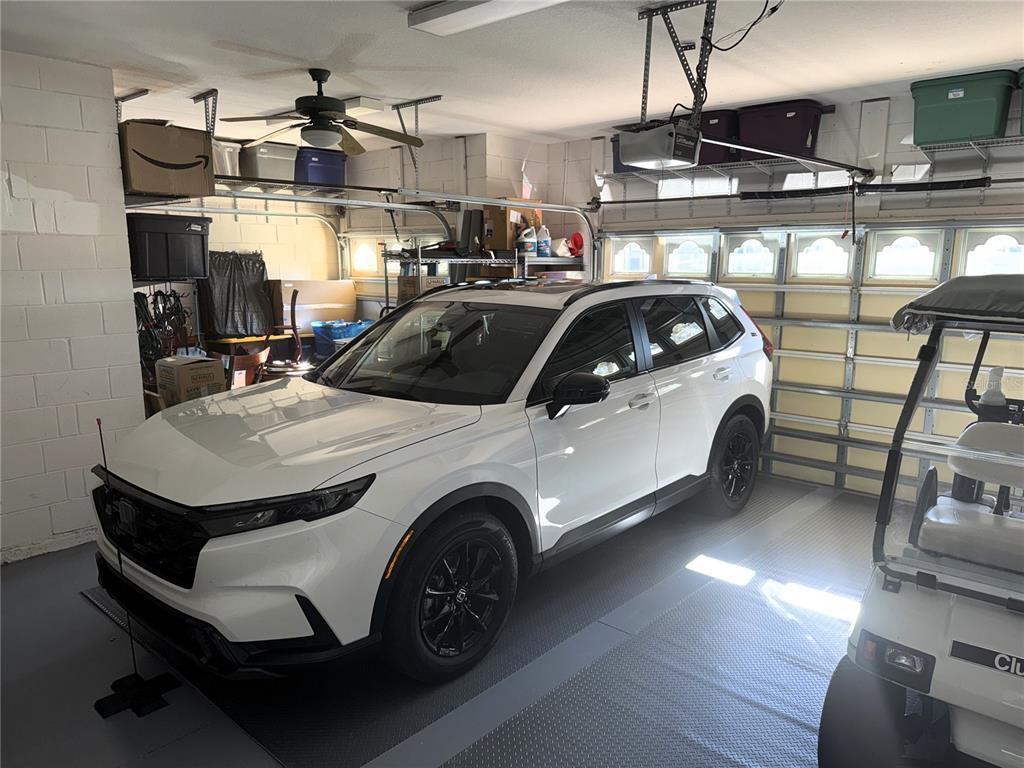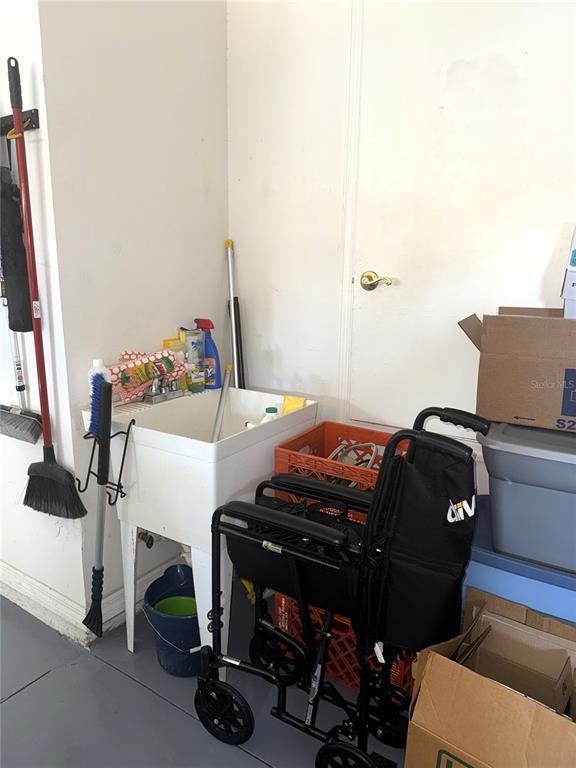 **Finished garage flooring, overhead storage, and laundry tub