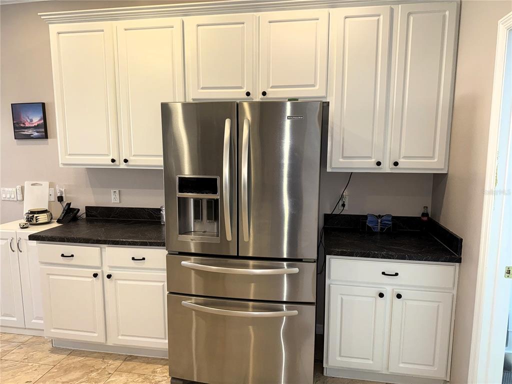 **Stainless steel appliances, including a 4-door refrigerator with water & ice