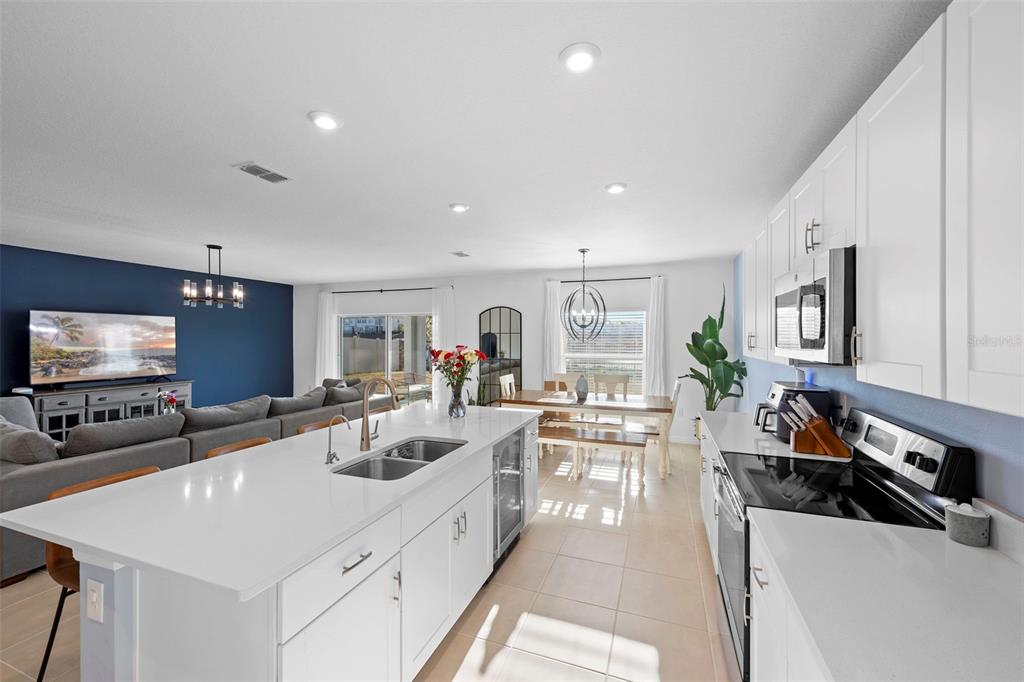 The interior showcases a bright, open-concept design with quartz countertops throughout, clean modern cabinetry, and finishes that reflect the quality and feel of new construction. The kitchen flows seamlessly into the main living area, making the space both inviting and practical for daily living and entertaining. The wine refrigerator does not convey and will be replaced by the seller with a brand-new dishwasher. Tile and carpet flooring are in excellent condition, and the home has been meticulously cared for.