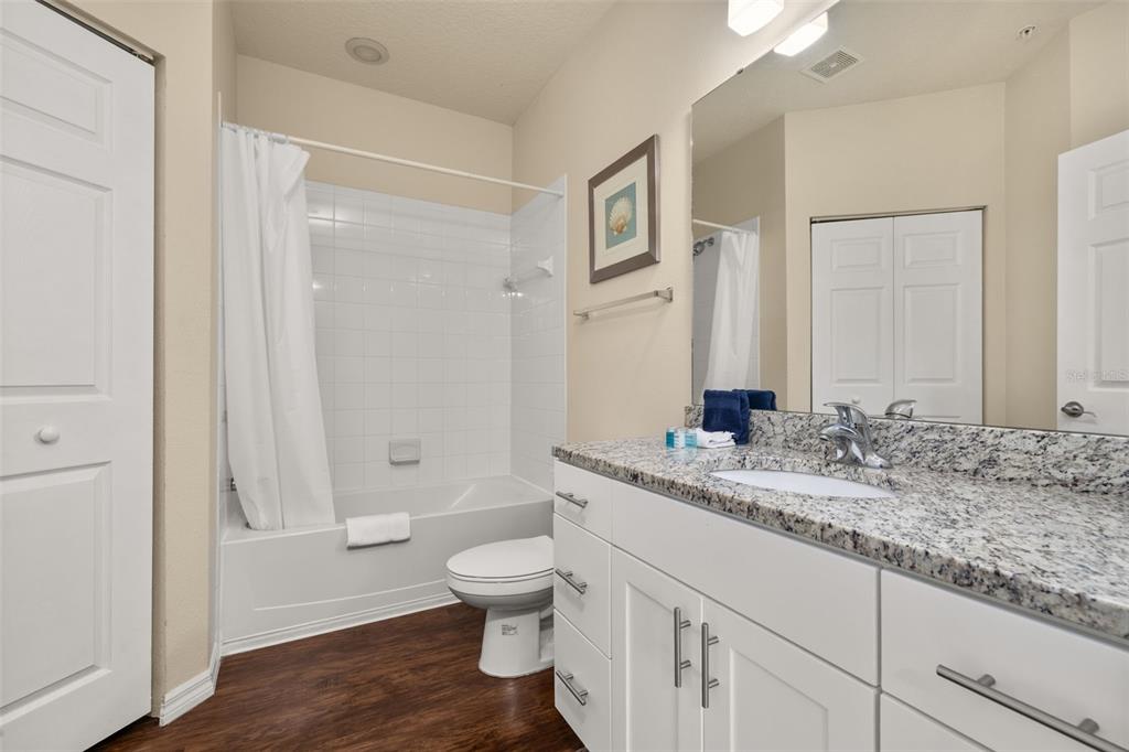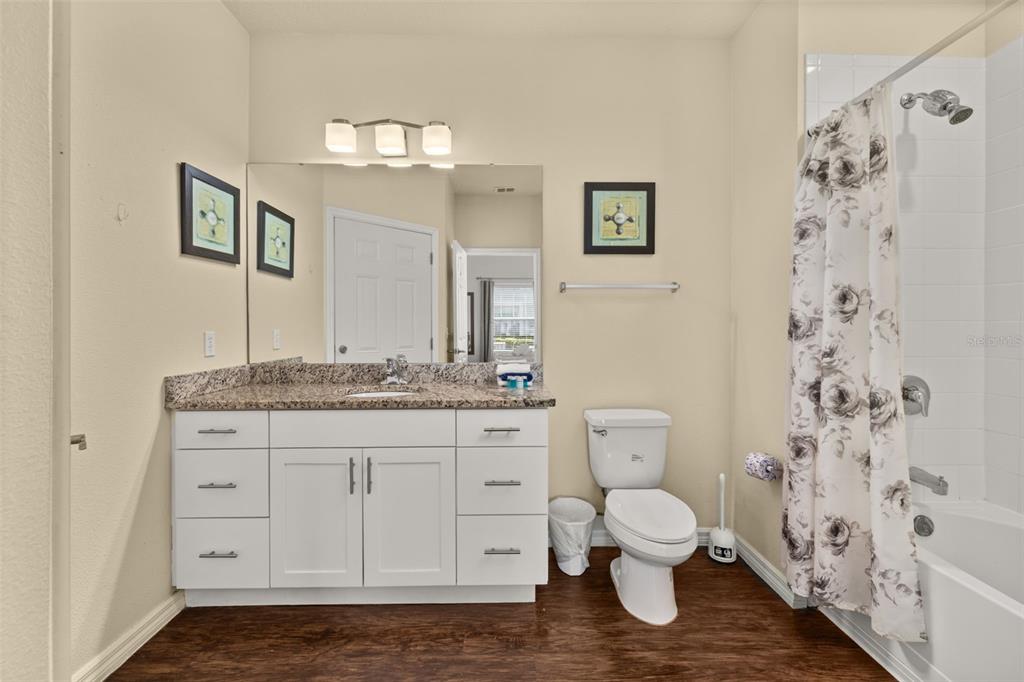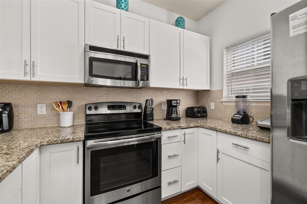 This beautiful home features laminate flooring throughout all main living areas and wet spaces, making maintenance a breeze. The spacious kitchen is outfitted with 32″ upper white cabinetry, dark granite countertops, and stainless-steel appliances, including refrigerator, range, microwave, and dishwasher. **Brand new A/C, replaced in 2025**.