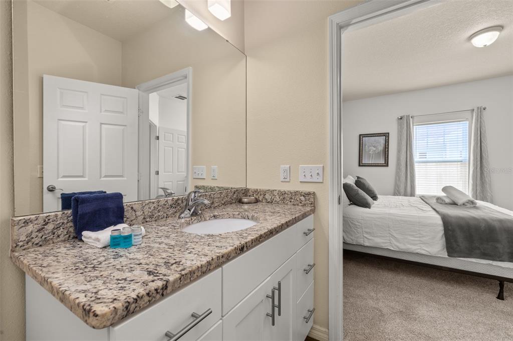 The first-floor carpeted master suite offers a large bathroom with granite counters, a double vanity, and a walk-in closet. Upstairs, you’ll also find carpeted bedrooms, with Bedrooms 2 and 3 sharing a full bathroom — plus a conveniently located laundry area.