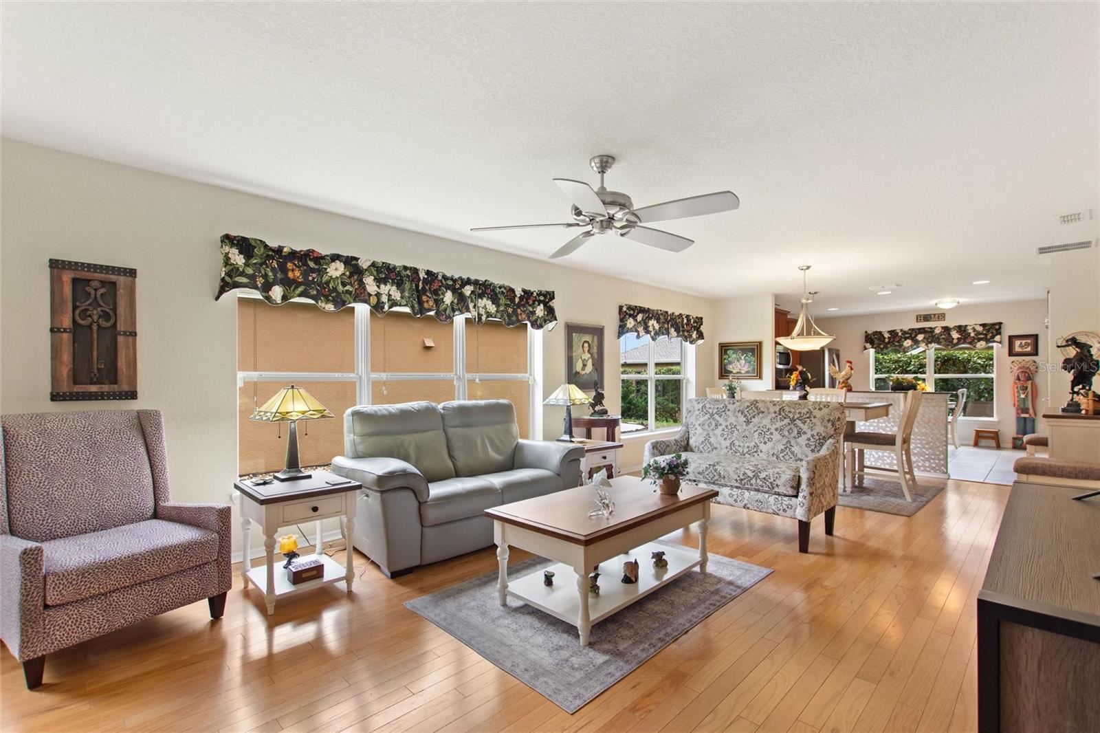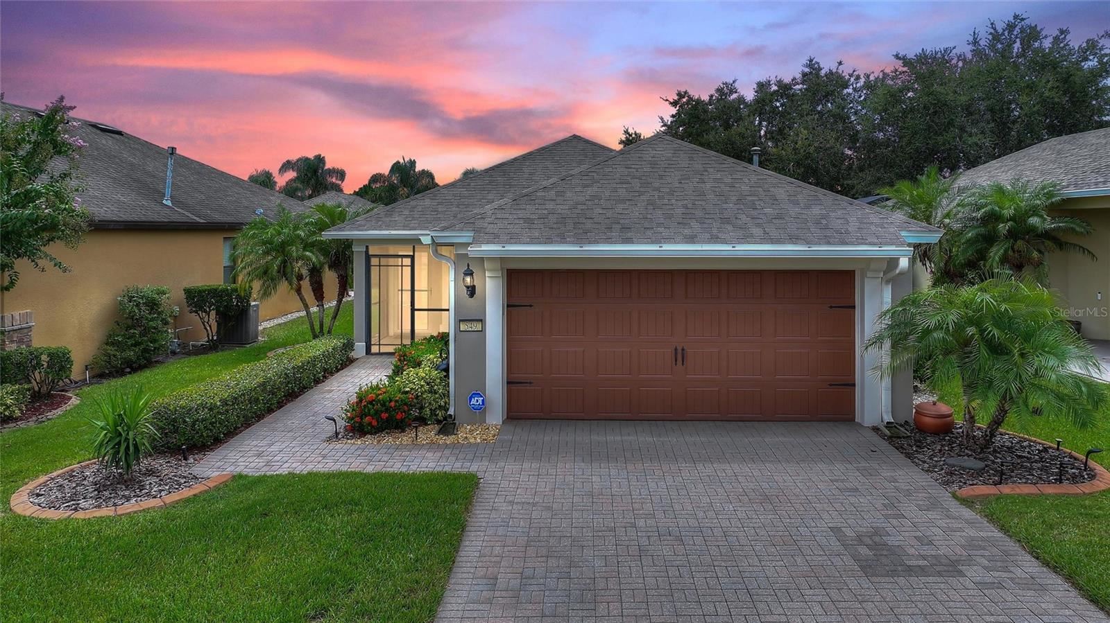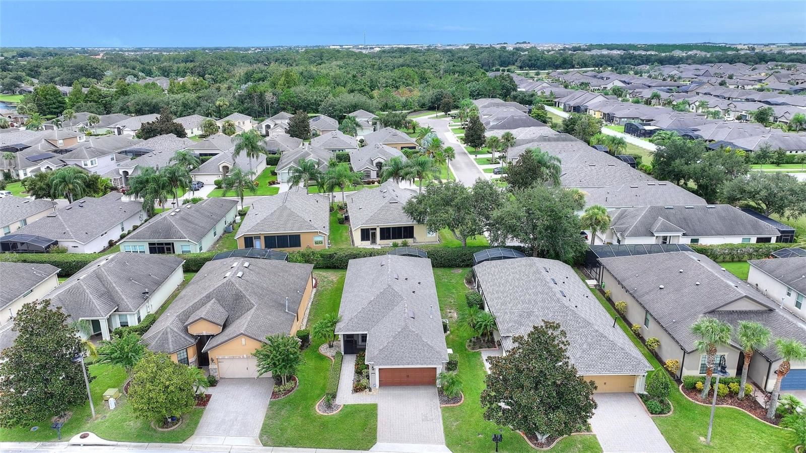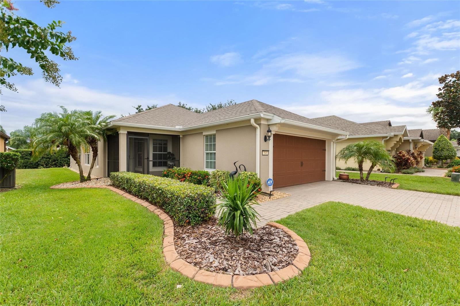Pristine move-in condition 3/2 Riviera model in Del Webb Orlando’s Vista Grande community with 2024 HVAC, 2021 Roof and 2020 Generac 22 kW Whole-House Generator has solid-surface floors throughout and is available to close on or after 10/15/2025. Screened front porch with full-view storm door opens to a bright and cheery central living area flanked by 3 bedrooms, a generous eat-in kitchen and an oversized south-facing screened lanai with adjacent patio. Newer stainless-steel kitchen appliances include a 5-burner natural gas stove. Triple patio doors to lanai from primary en suite bedroom with walk-in closet and updated full bath. Newer ceiling fans, COR thermostat and recessed lighting. Titan floors in garage, screened lanai and on patio. Ceiling-mounted storage and shelving unit in garage with Titan floor. Freezer in garage is reserved. Natural gas and electric dryer hookups in laundry closet. Existing dryer is powered by electricity. Mature landscaping inside custom cement shrub bed curbing with mulch & river rock. Partial seamless gutters. Owned ADT security system equipment. Actively managed Sentricon pest control system. Select furnishings available for sale separately. Sold As-Is. Ridgewood Lakes is a golf cart friendly community. $352 monthly Del Webb Orlando HOA fee provides lawn cutting and shrub bed trimming + exclusive access to the HOA-owned 30,000 SF Montecito clubhouse with indoor & outdoor heated pools, hot tub, fitness center, walking track and pub. Pickle ball, bocce and tennis courts, dog parks and sidewalks. $425 semi-annual Ridgewood Lakes HOA fee provides 24×7 staffed security gate and master association-owned private road maintenance. Del Webb Orlando is a 55+ community with full-time lifestyle directors, located in Ridgewood Lakes gated community with miles of walking & biking trails and adjacent to 18-hole White Heron Golf Club, privately owned and open to the public. Shopping, Disney & Central Florida entertainment nearby, easy access to I-4, medical facilities, airports and Sunrail Station. Advent Health hospital 3 miles away.