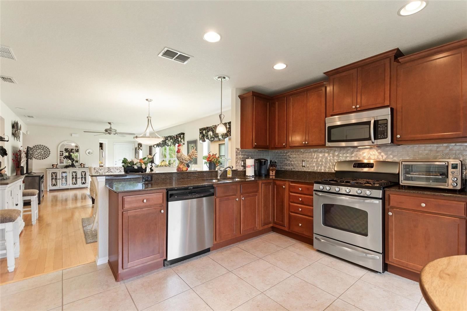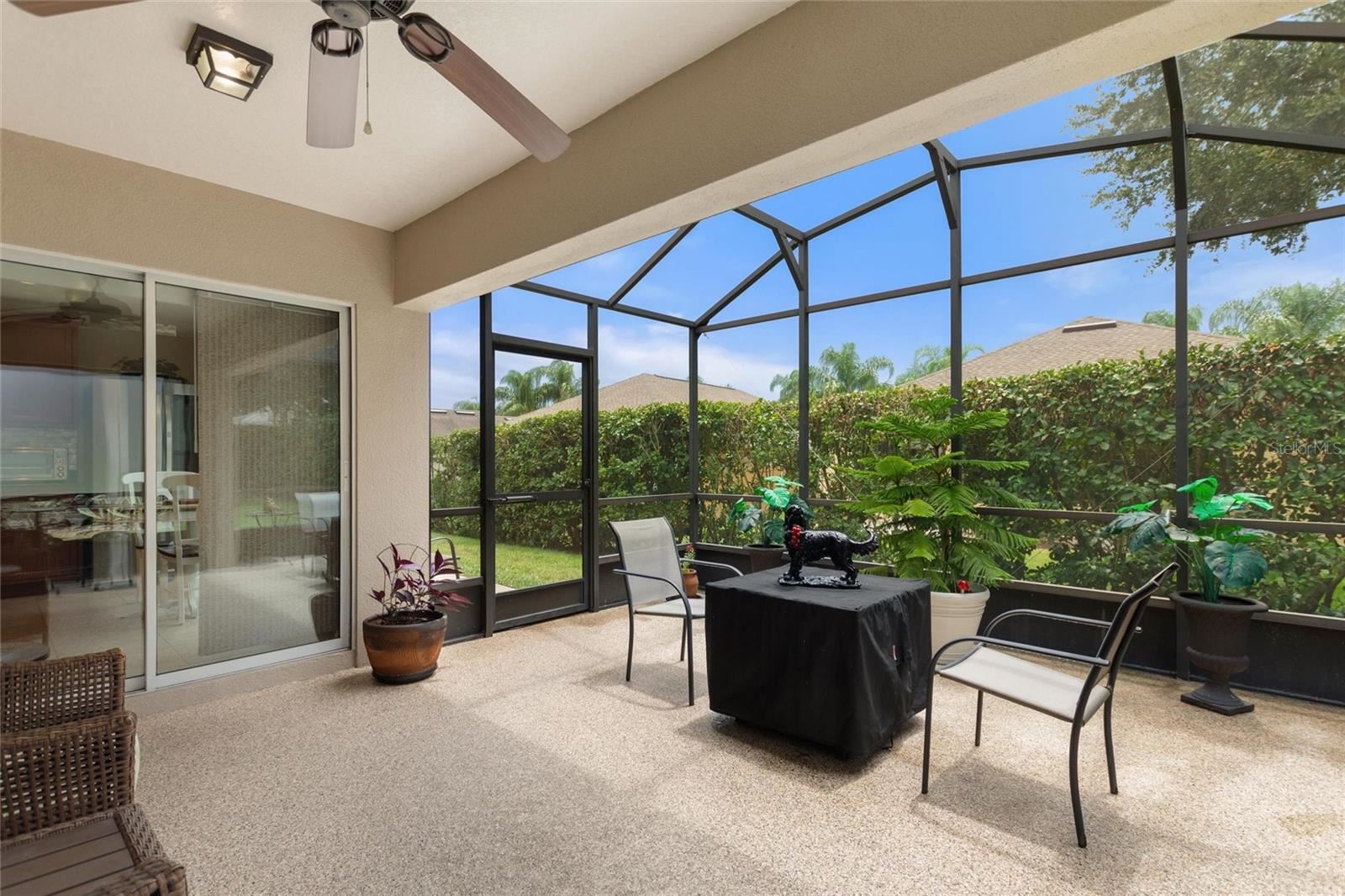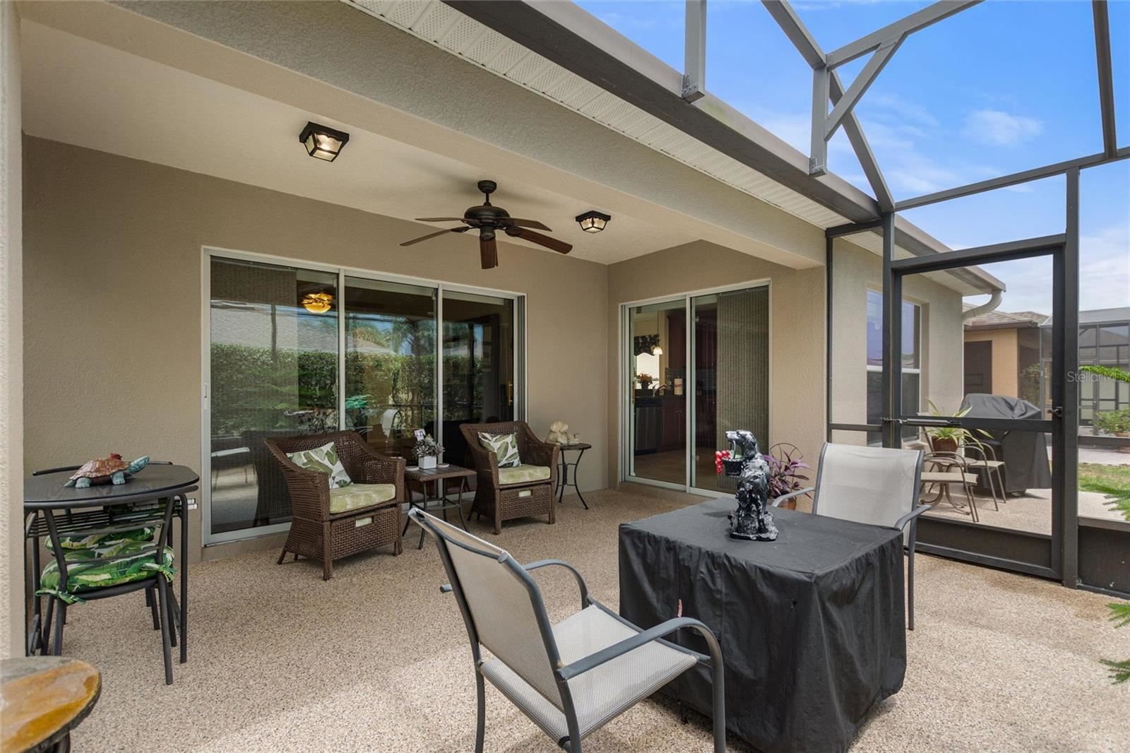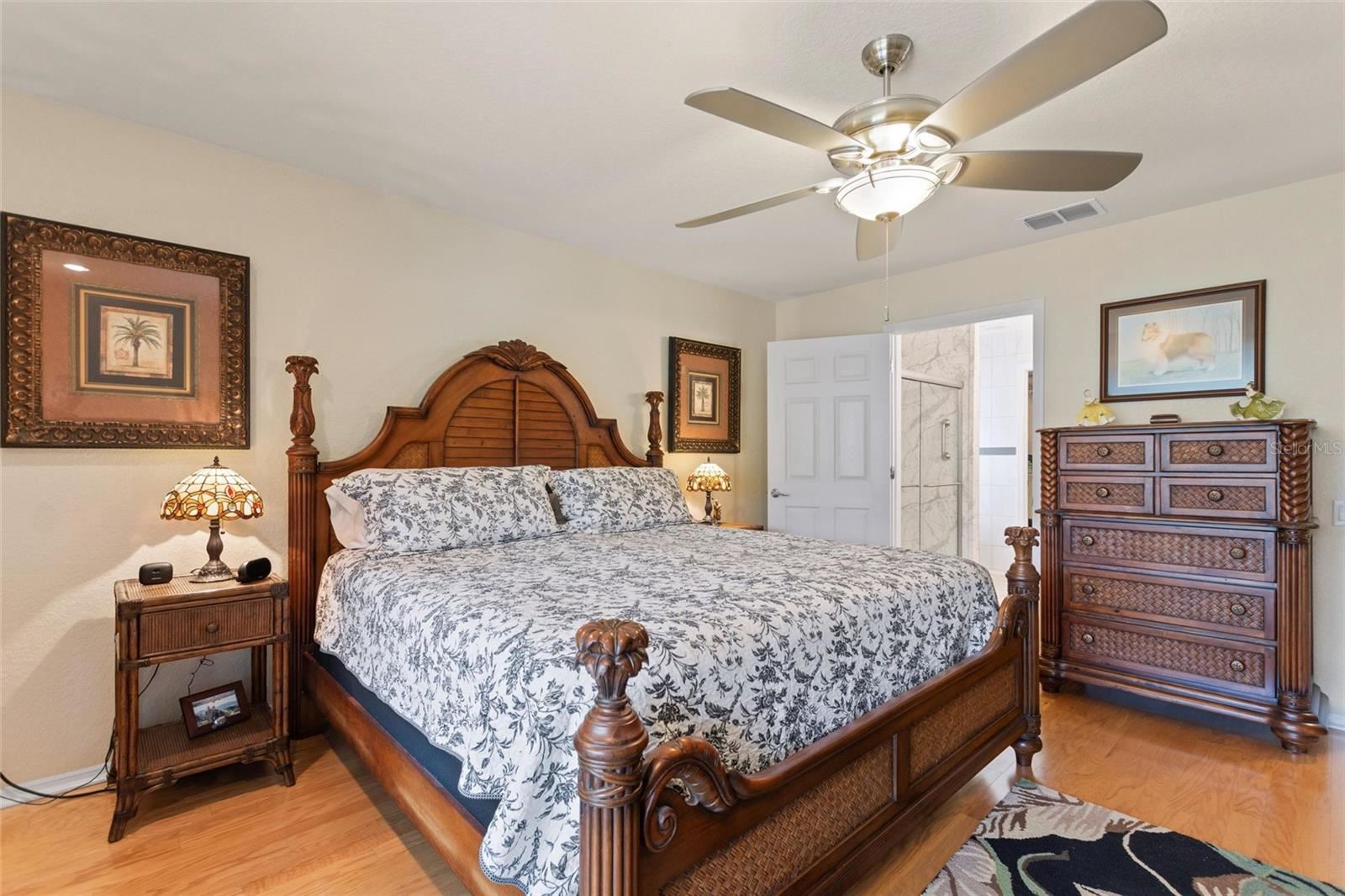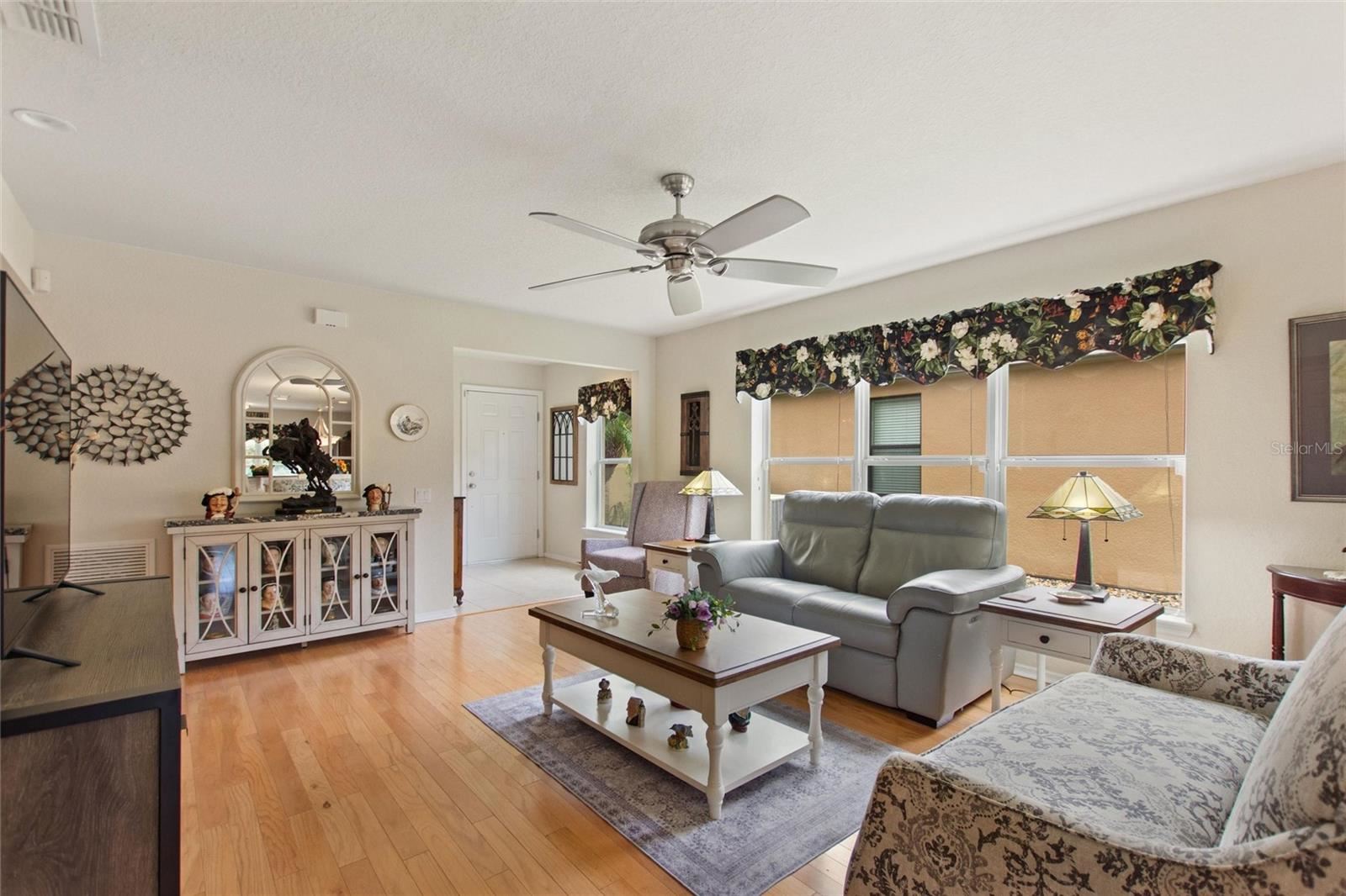 Pristine move-in condition 3/2 Riviera model in Del Webb Orlando’s Vista Grande community with 2024 HVAC, 2021 Roof and 2020 Generac 22 kW Whole-House Generator has solid-surface floors throughout and is available to close on or after 10/15/2025. Screened front porch with full-view storm door opens to a bright and cheery central living area flanked by 3 bedrooms, a generous eat-in kitchen and an oversized south-facing screened lanai with adjacent patio. Newer stainless-steel kitchen appliances include a 5-burner natural gas stove. Triple patio doors to lanai from primary en suite bedroom with walk-in closet and updated full bath. Newer ceiling fans, COR thermostat and recessed lighting. Titan floors in garage, screened lanai and on patio. Ceiling-mounted storage and shelving unit in garage with Titan floor. Freezer in garage is reserved. Natural gas and electric dryer hookups in laundry closet. Existing dryer is powered by electricity. Mature landscaping inside custom cement shrub bed curbing with mulch & river rock. Partial seamless gutters. Owned ADT security system equipment. Actively managed Sentricon pest control system. Select furnishings available for sale separately. Sold As-Is. Ridgewood Lakes is a golf cart friendly community. $352 monthly Del Webb Orlando HOA fee provides lawn cutting and shrub bed trimming + exclusive access to the HOA-owned 30,000 SF Montecito clubhouse with indoor & outdoor heated pools, hot tub, fitness center, walking track and pub. Pickle ball, bocce and tennis courts, dog parks and sidewalks. $425 semi-annual Ridgewood Lakes HOA fee provides 24×7 staffed security gate and master association-owned private road maintenance. Del Webb Orlando is a 55+ community with full-time lifestyle directors, located in Ridgewood Lakes gated community with miles of walking & biking trails and adjacent to 18-hole White Heron Golf Club, privately owned and open to the public. Shopping, Disney & Central Florida entertainment nearby, easy access to I-4, medical facilities, airports and Sunrail Station. Advent Health hospital 3 miles away.