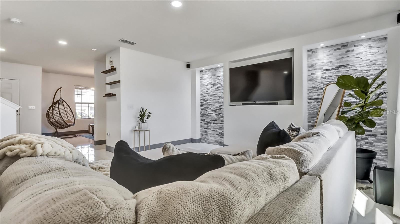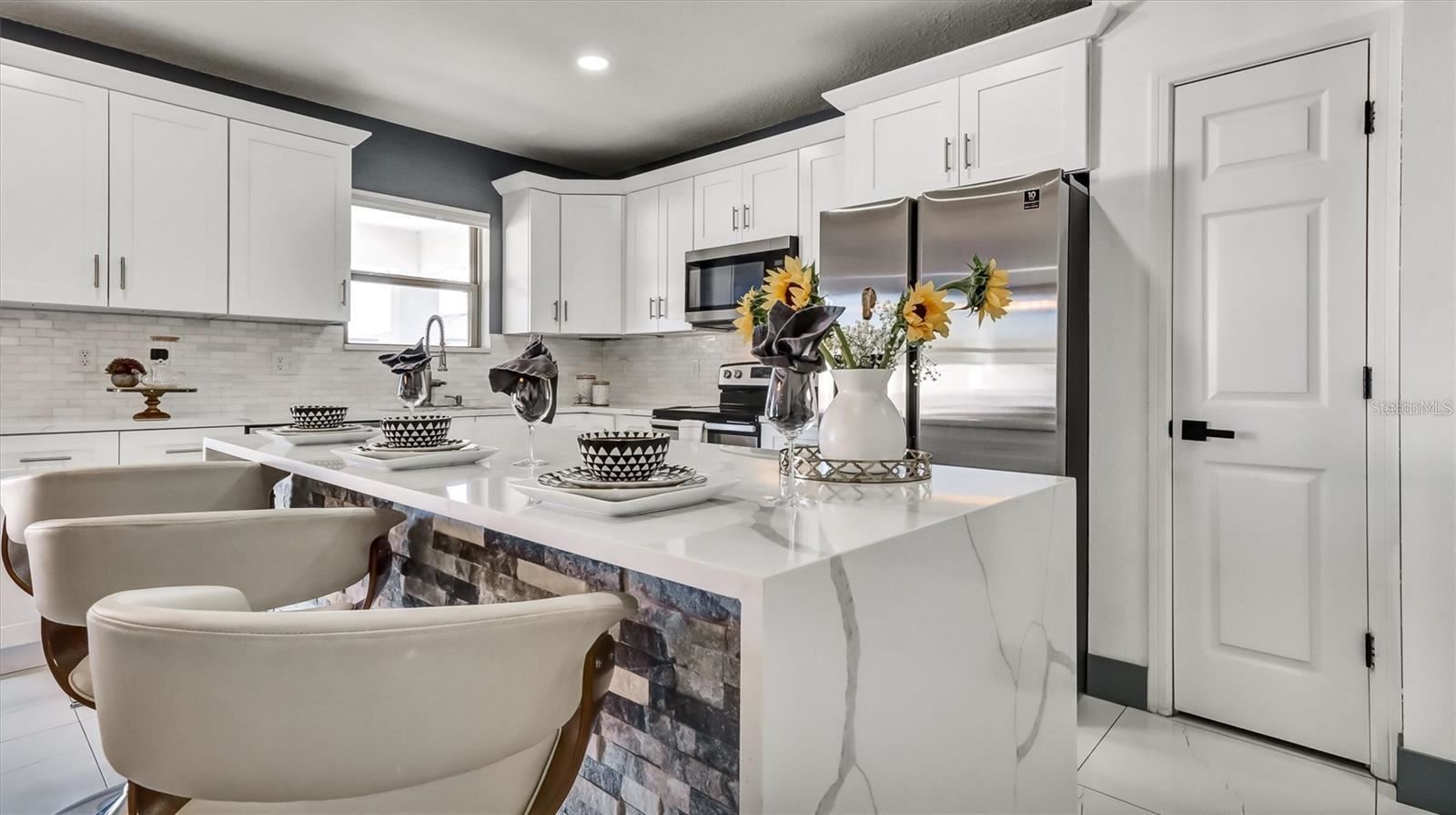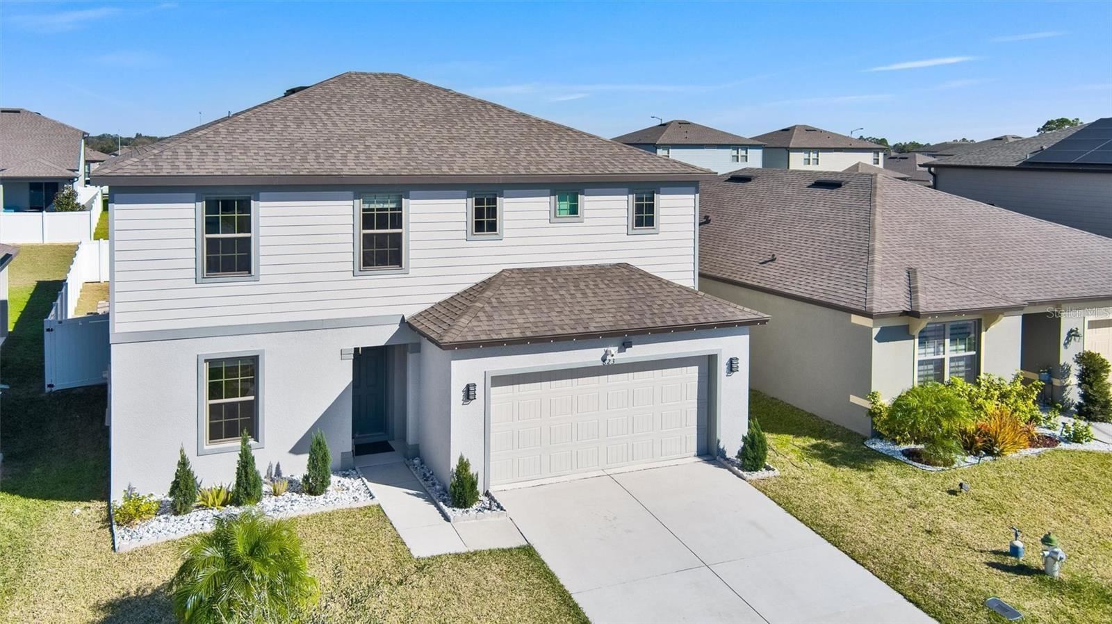 This stunning 4-bedroom, 2.5-bath home, built in 2021, combines modern design with luxurious finishes. The open-concept floor plan flows seamlessly throughout the first floor, highlighted by 24×24 porcelain tile with a sleek marble look. The gourmet kitchen showcases wood cabinetry, a striking Calacatta quartz waterfall-edge island, and elegant quartz countertops carried into the bathrooms. The master suite offers a spacious custom walk-in closet, creating the perfect retreat. Step outside to a private fenced backyard””ideal for a future pool””complete with a paved lanai for relaxation or entertaining. Additional features include energy-efficient windows, a sprinkler system, security cameras, and surround sound speakers in the living area. Conveniently located near top restaurants, world-famous theme parks, and premier outlet shopping, this home delivers both comfort and style in the heart of Central Florida living.