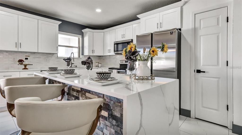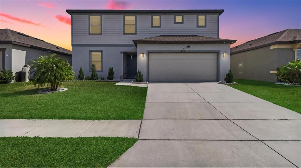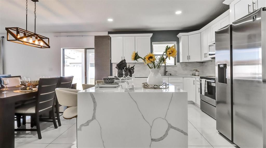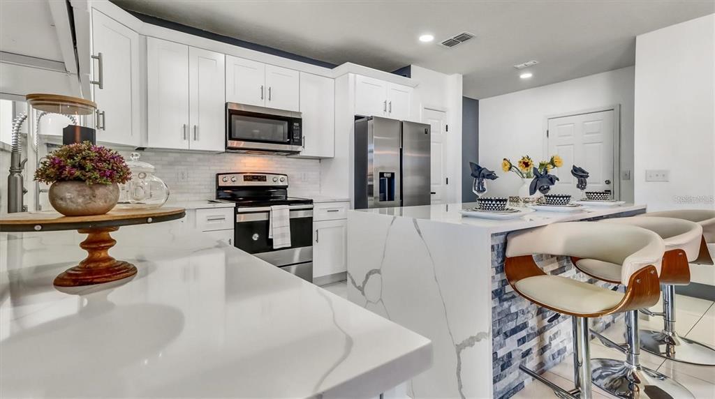 This stunning 4-bedroom, 2.5-bath home, built in 2021, combines modern design with luxurious finishes. The open-concept floor plan flows seamlessly throughout the first floor, highlighted by 24×24 porcelain tile with a sleek marble look. The gourmet kitchen showcases wood cabinetry, a striking Calacatta quartz waterfall-edge island, and elegant quartz countertops carried into the bathrooms. The master suite offers a spacious custom walk-in closet, creating the perfect retreat.
