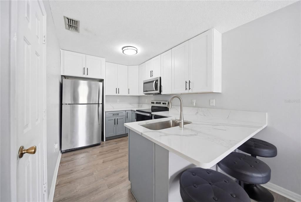 The upgraded kitchen boasts quartz countertops, Modern cabinetry, and stainless steel appliances, along with a breakfast bar perfect for entertaining or casual dining. The living area flow seamlessly, enhanced by natural light and a spacious layout.