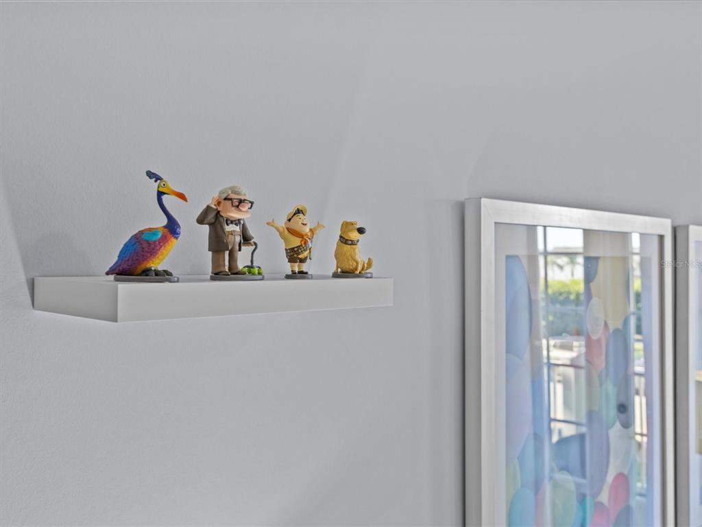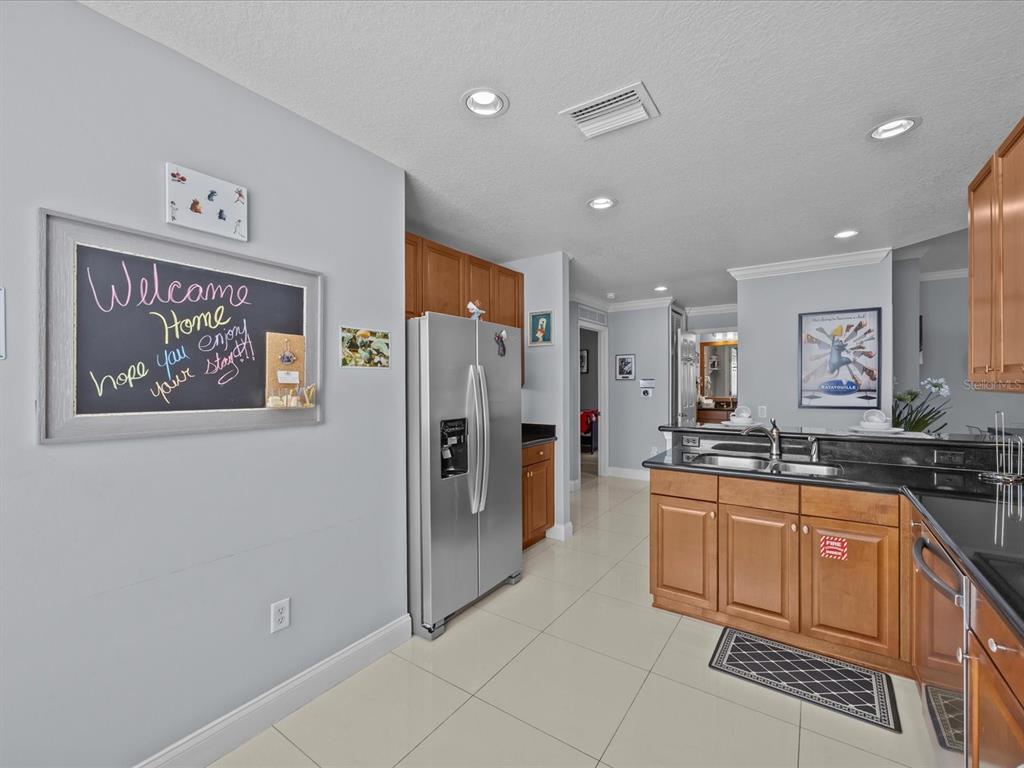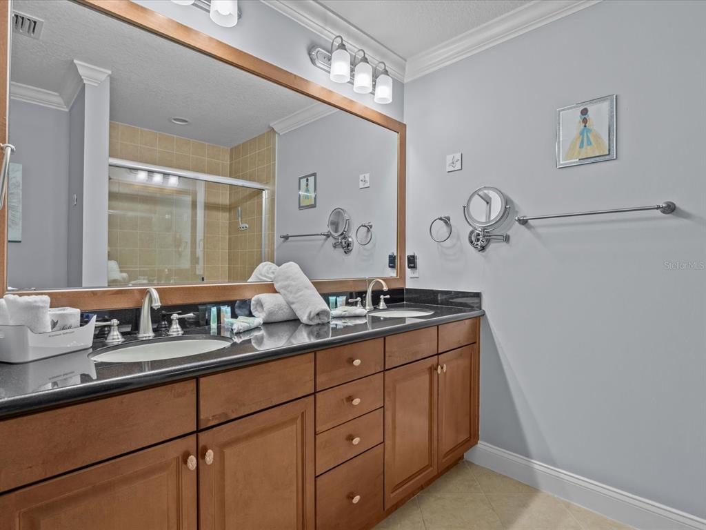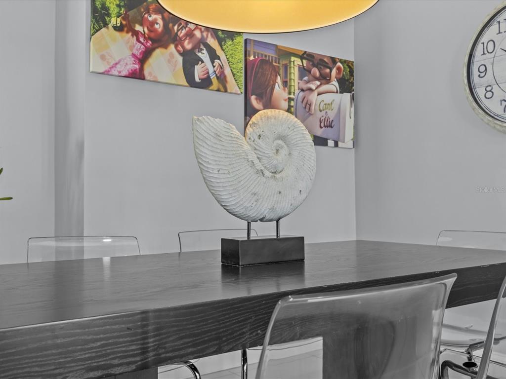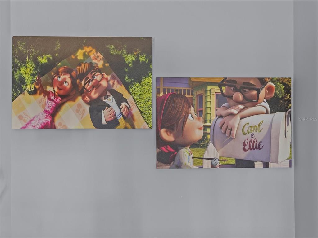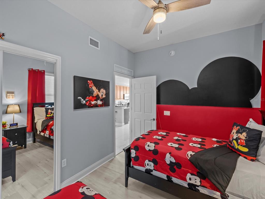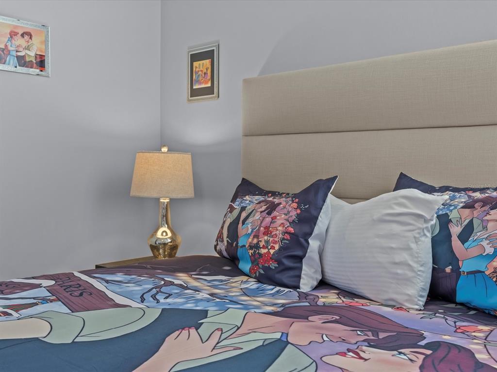 The open living and dining area is bright and welcoming, featuring plush seating, a modern aesthetic, and sliding glass doors that open to a private covered porch/balcony—ideal for morning coffee or evening relaxation. The full kitchen is both functional and elegant, with stainless steel appliances, granite countertops, and a breakfast bar that makes casual dining effortless. Retreat to the serene king suite, while the additional bedrooms offer flexibility for family, guests, or a home office. A cheerful Disney-themed twin room adds character and charm, perfect for visiting little ones. Soft neutral tones, designer finishes, and tasteful accents throughout create a warm, move-in-ready feel.