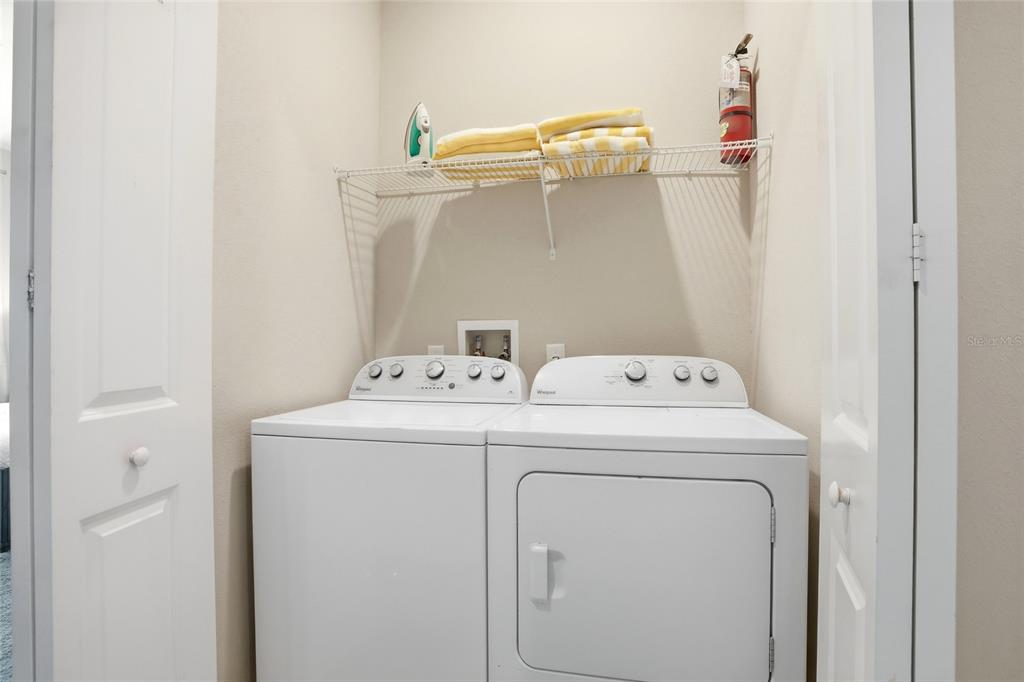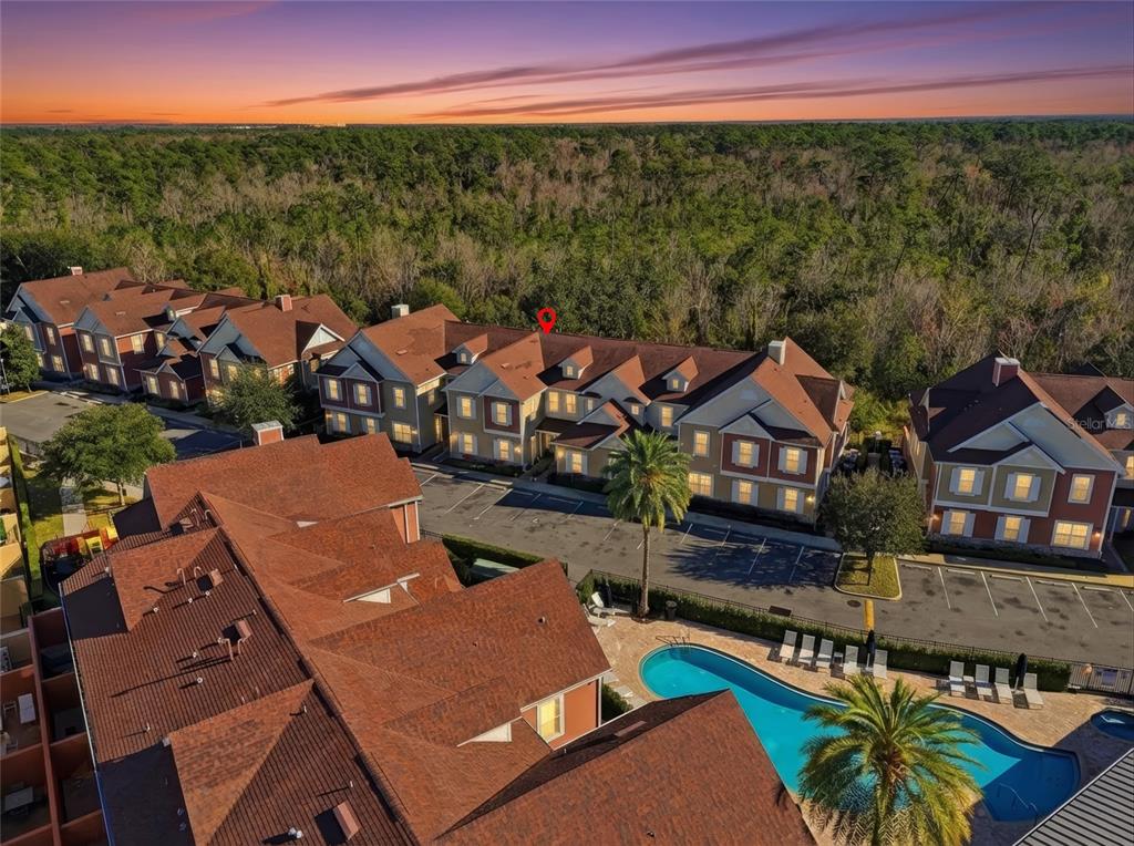 Upstairs, the expansive primary suite offers a true retreat with wooded views, walk-in closet, dual-sink vanity, large walk-in shower, and soaking tub. Two additional bedrooms upstairs add unique charm — one overlooking the community pool, the other with a walk-in closet. A laundry closet with washer and dryer makes everyday living or guest turnovers a breeze.