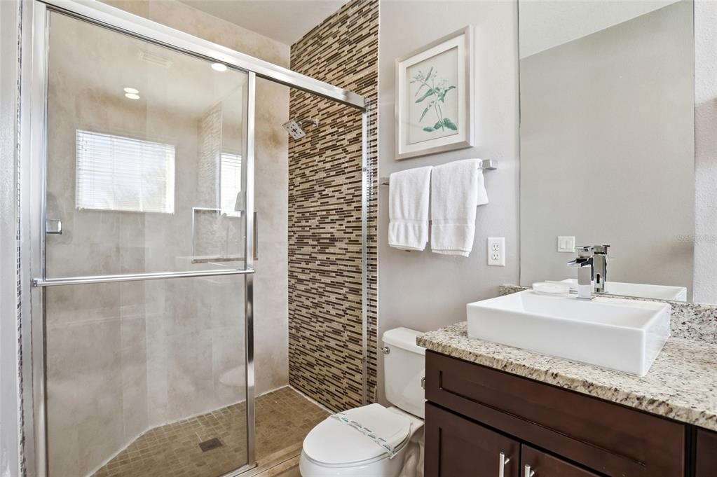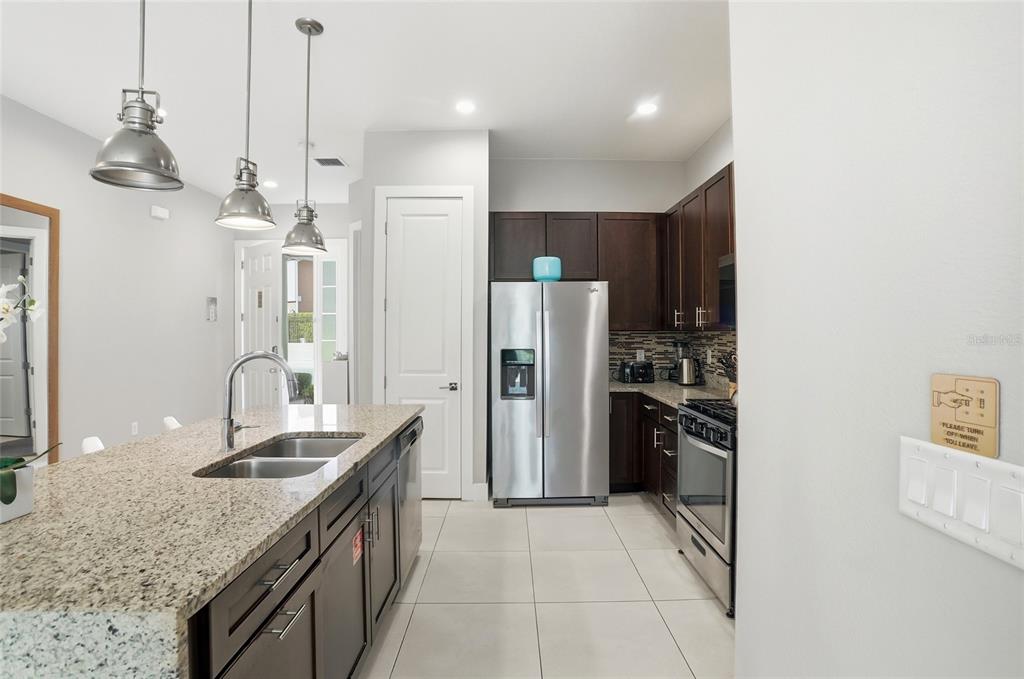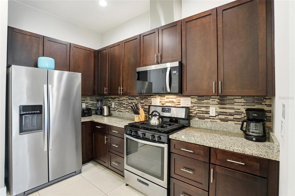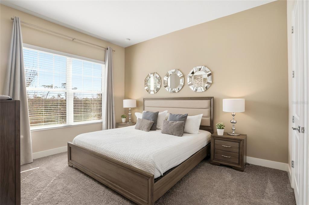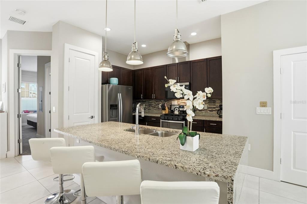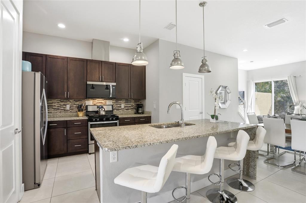 Inside, four spacious bedrooms, each with BRAND NEW CARPET, feature their own private en-suite, providing comfort and privacy for family, guests, or vacation renters. The main floor welcomes you with a bright, open layout including a full bedroom suite, half bath, and gourmet kitchen with a large island, granite countertops, and stainless steel appliances and new microwave. The great room flows out to a tranquil PATIO FRAMED BY WOODED VIEWS, perfect for unwinding after a day at the parks.