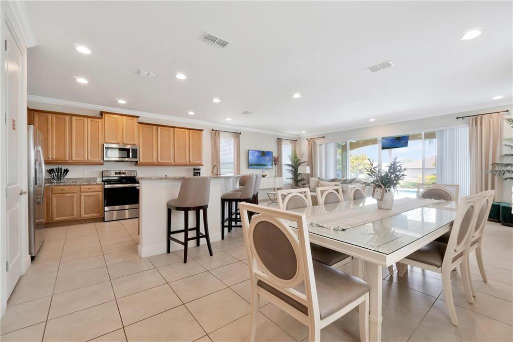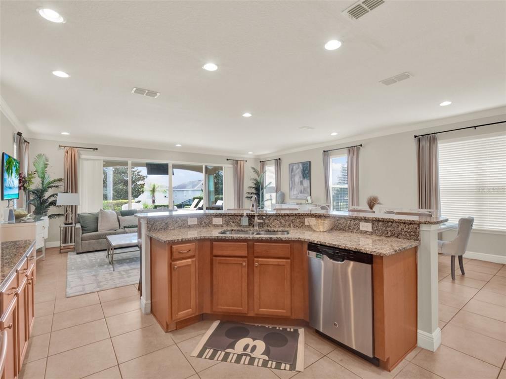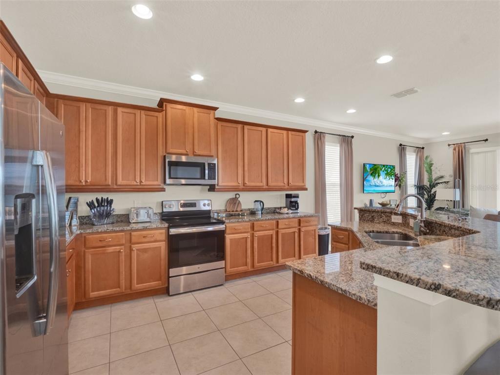 Step inside to discover a grand open-concept layout, where the spacious family room, expansive dining area, and chef-style kitchen come together effortlessly, ideal for hosting large groups or unforgettable family getaways. The kitchen boasts modern maple cabinetry, granite countertops, and stainless steel appliances, making entertaining both stylish and practical.