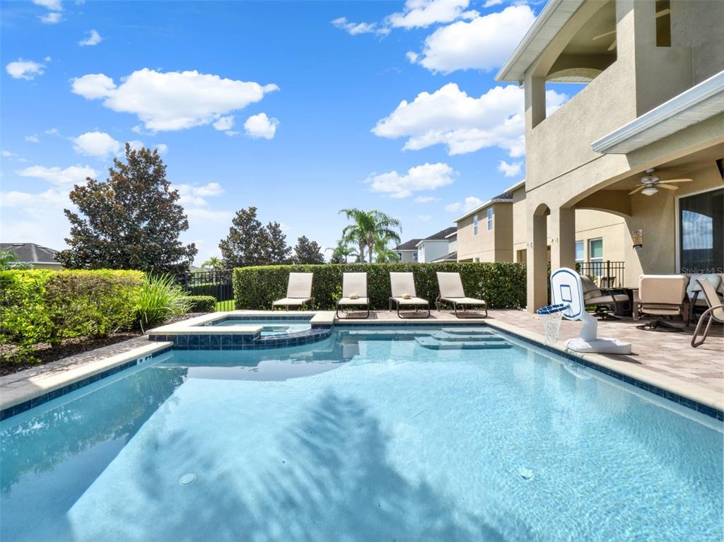 The second-floor primary suite overlooks your private backyard oasis, featuring a sparkling pool, bubbling spa, and a fully equipped summer kitchen, all surrounded by lush tropical landscaping and a brick-paved pool deck designed for soaking in the Florida sun.