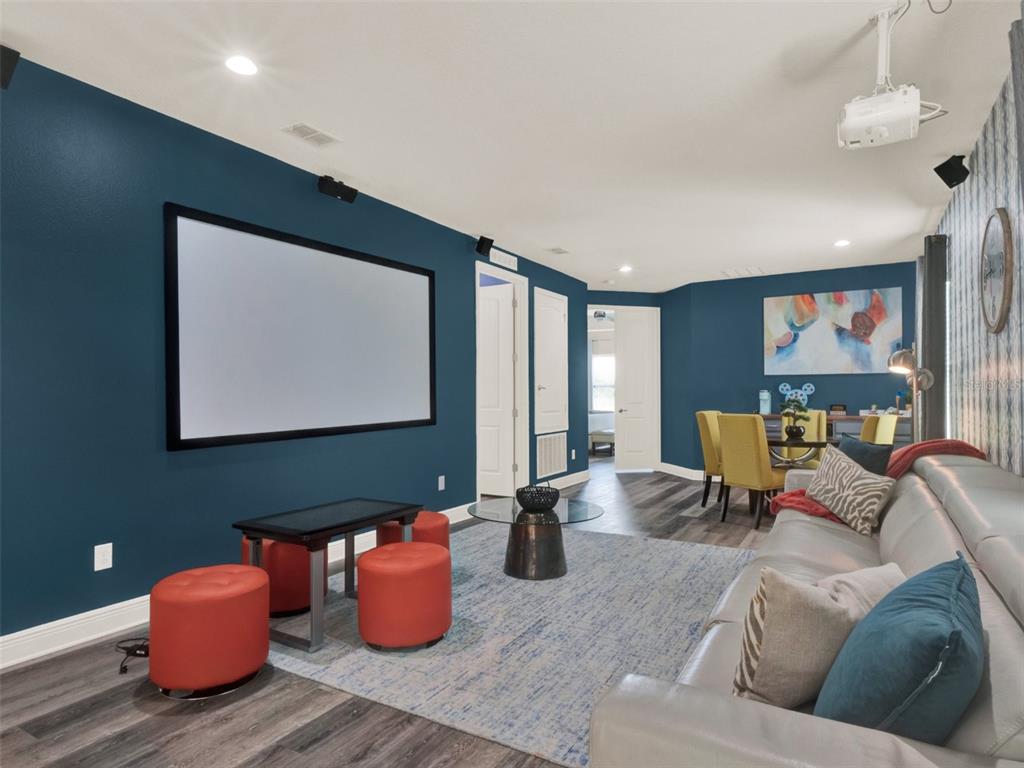 This thoughtfully designed floor plan features a primary suite on the main level with a private ensuite, along with a custom-designed air-conditioned game room for non-stop entertainment. Upstairs, the oversized bonus room/movie loft invites guests to unwind with movie marathons, thrilling video games, or sports on a massive screen.