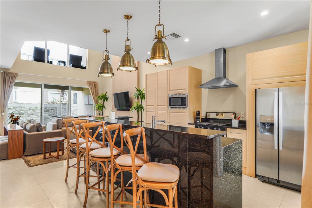The welcoming foyer leads to a functional and elegant open floor plan, highlighted by a modern kitchen equipped with stainless steel appliances, including a gas stove, and a spacious breakfast bar ideal for casual dining or entertaining. The impressive Great Room features soaring two-story ceilings, large windows, and sliding glass doors that allow natural light to fill the space, creating a bright and inviting atmosphere.