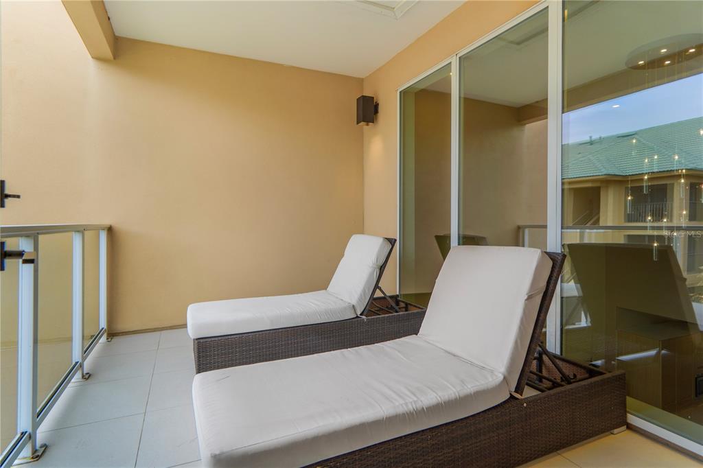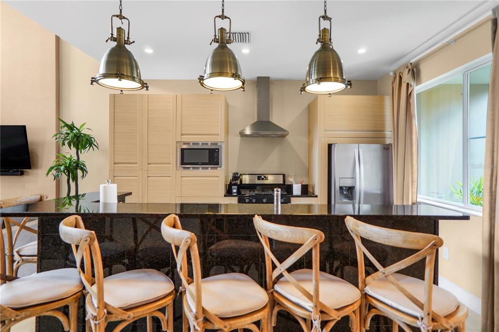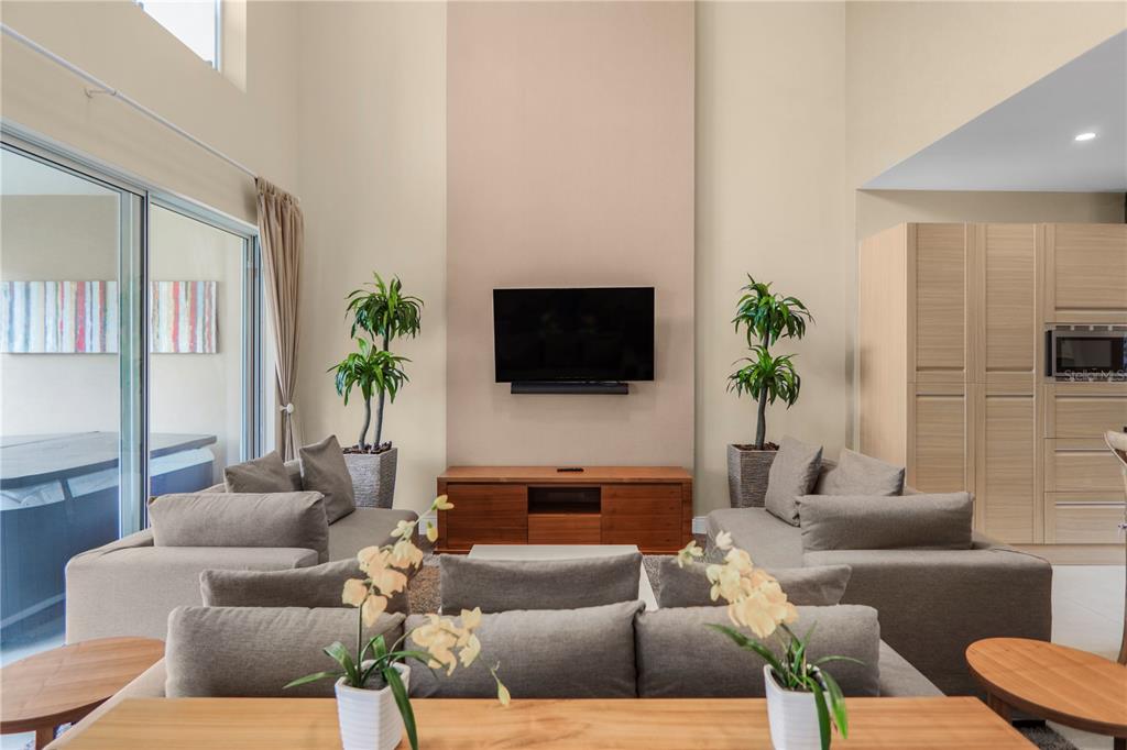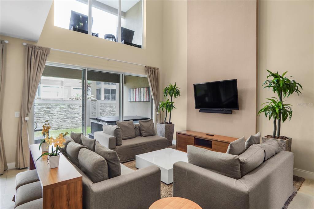 The sliding doors lead to a covered lanai designed for relaxing and entertaining. The outdoor area includes a built-in summer kitchen with sink and grill, comfortable seating space, and a PRIVATE JACCUZZI, perfect for unwinding after a full day enjoying Orlando’s theme parks.