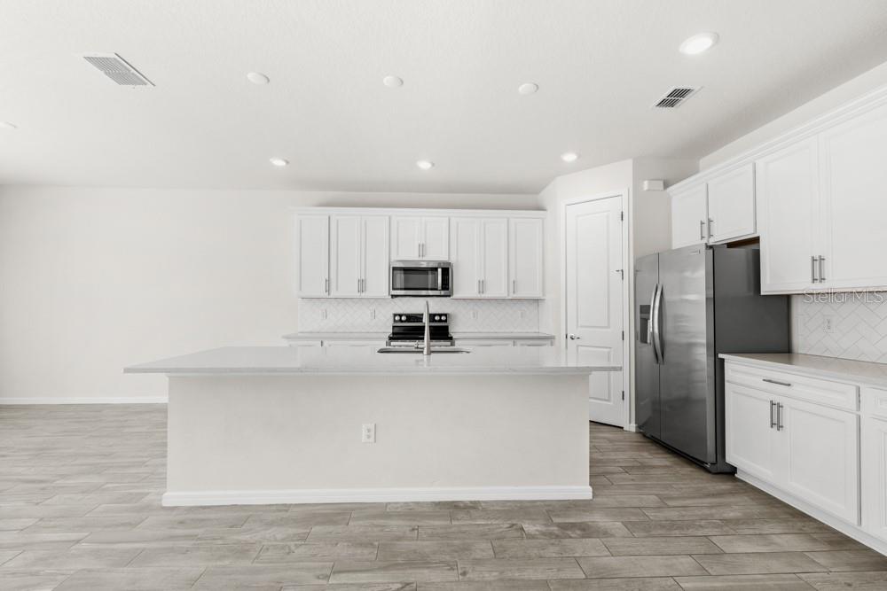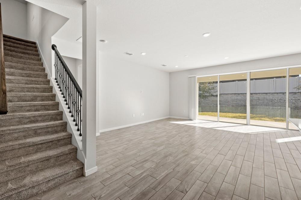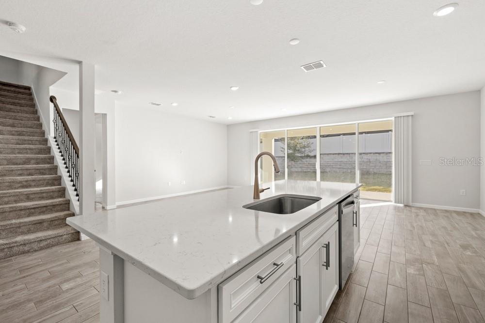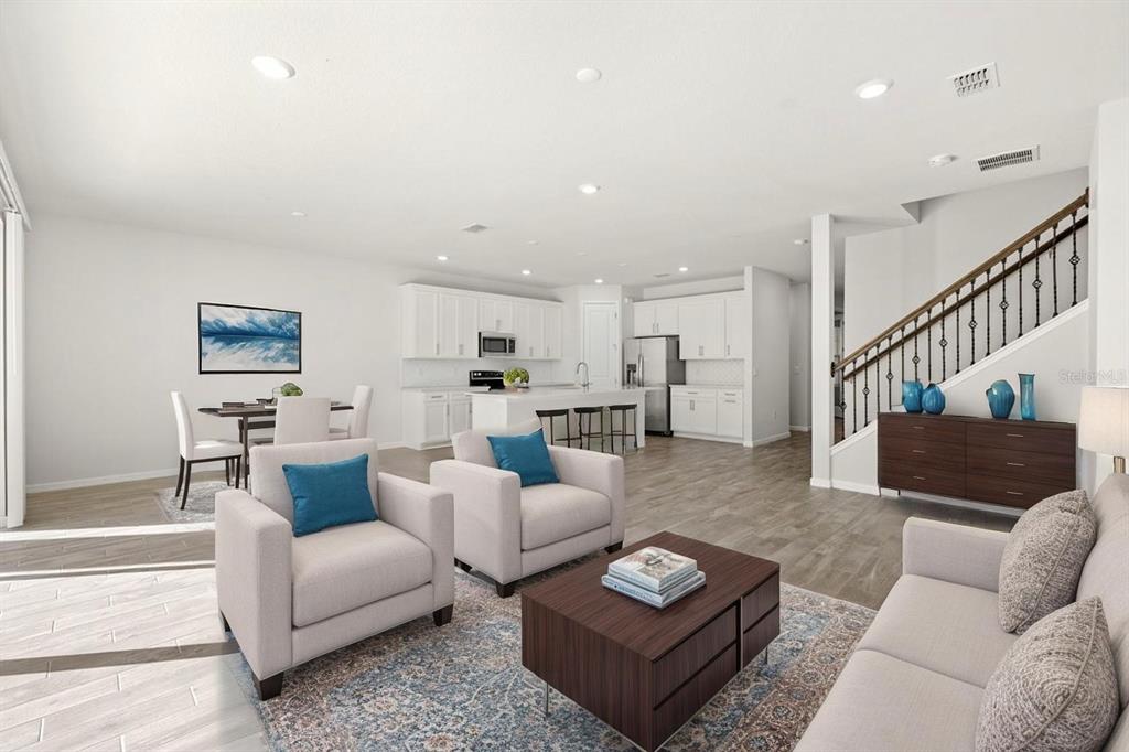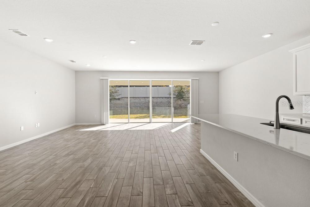 The layout is open and functional, connecting the main living area, dining space, and kitchen in a natural flow. The kitchen features a large island, ample counter space, and generous cabinetry, all open to the great room. Sliding doors lead to an oversized covered lanai, creating the indoor outdoor lifestyle many Florida homeowners look for, especially when hosting. The backyard provides space to design a pool or customize the outdoor area.