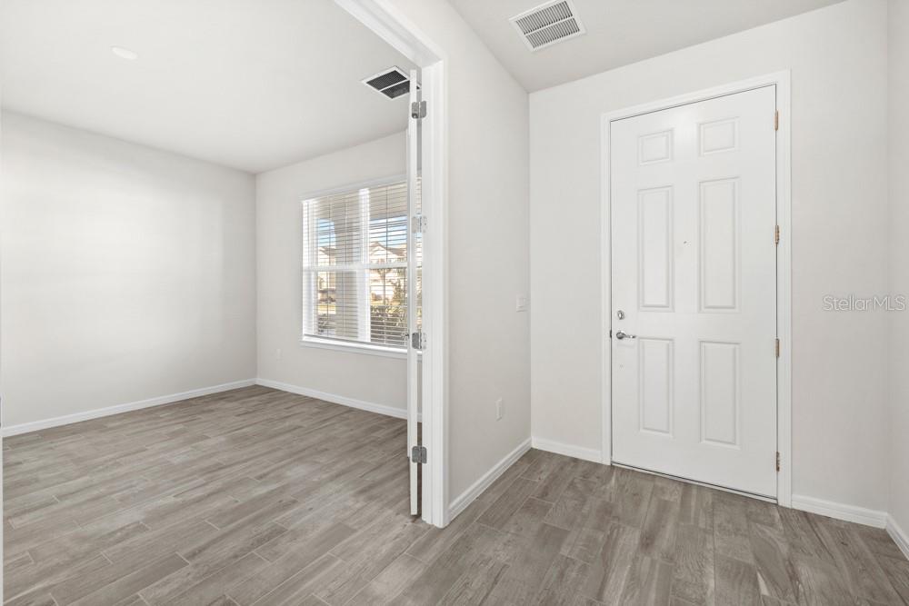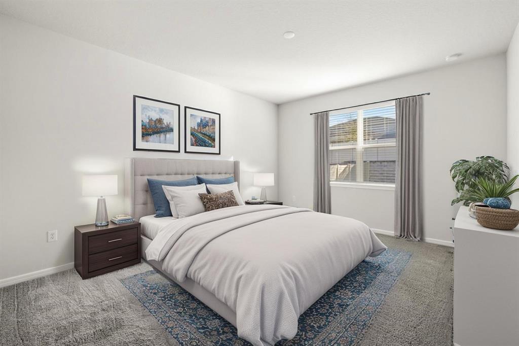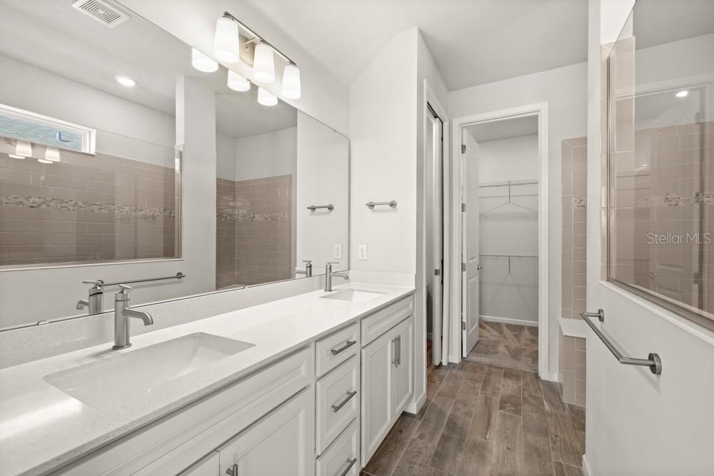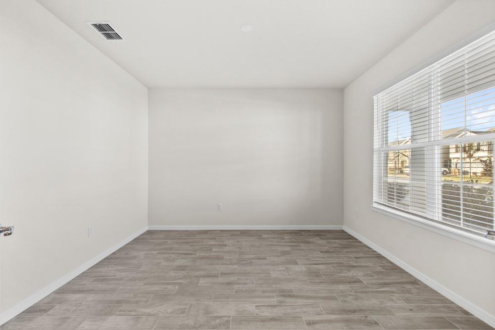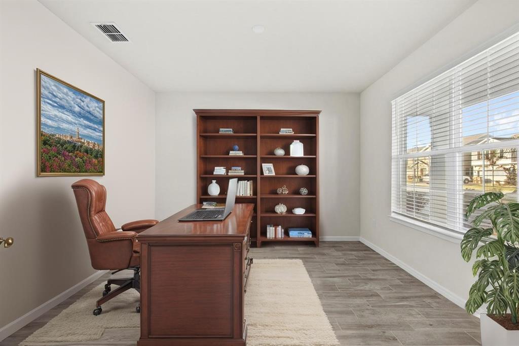 The first floor primary suite is privately positioned for convenience. The primary ensuite bathroom features Pulte’s Super Shower upgrade, an oversized walk in design with dual shower heads that creates a modern spa inspired feel and replaces the traditional tub and shower combination. A dedicated office on the main level offers flexible workspace.