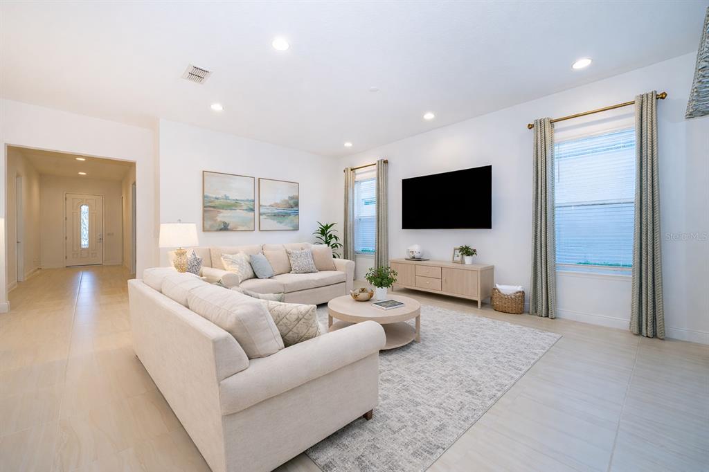 Over $60,000 in builder upgrades enhance nearly every space. The gourmet kitchen serves as the heart of the home and features upgraded quartz countertops, deluxe appliances, 3 pendant lights, designer lighting with dimmers, and upgraded porcelain tile flooring that flows seamlessly through the living room, dining room, and foyer. Eight foot doors throughout the home create an open and elegant feel, while the tray ceiling in the dining room and additional recessed lighting in the living room elevate the overall ambiance.