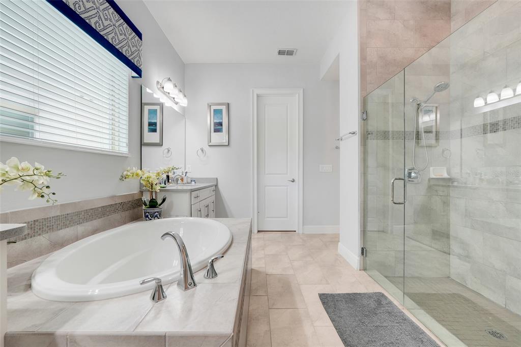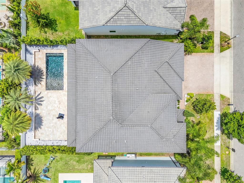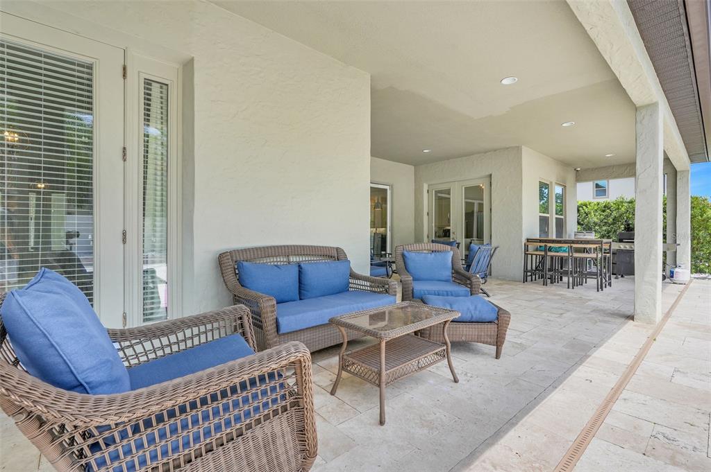 Step outside to your private oasis — an elegantly designed backyard boasting a sparkling modern pool with crisp tile accents and a sun shelf, surrounded by tropical landscaping and luxurious travertine decking. The covered lanai invites you to relax and unwind, enjoying the best of Florida’s sunshine in total privacy.
