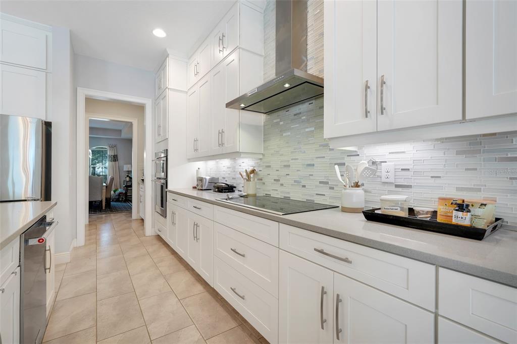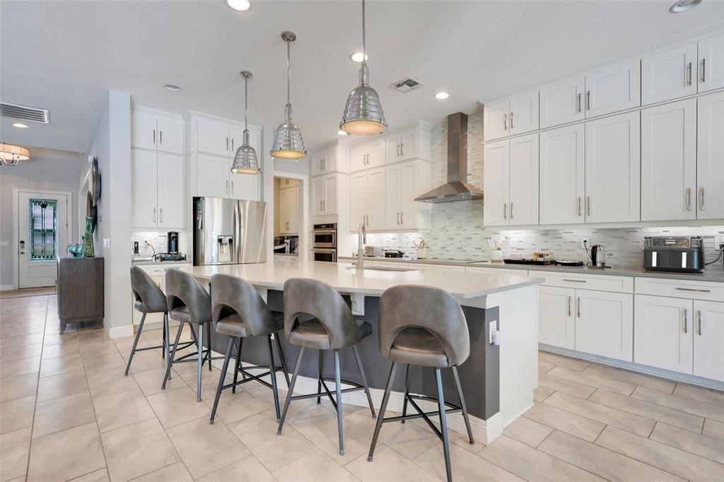 The heart of the home is an expansive gourmet kitchen featuring custom 42” cabinetry, sleek granite countertops, premium stainless steel appliances, dual oversized center islands, and a walk-in pantry fit for a chef. An inviting casual dining space flows seamlessly into the open-concept family room, ideal for effortless entertaining. A butler’s pantry connects to the formal dining room, adding both convenience and elegance.