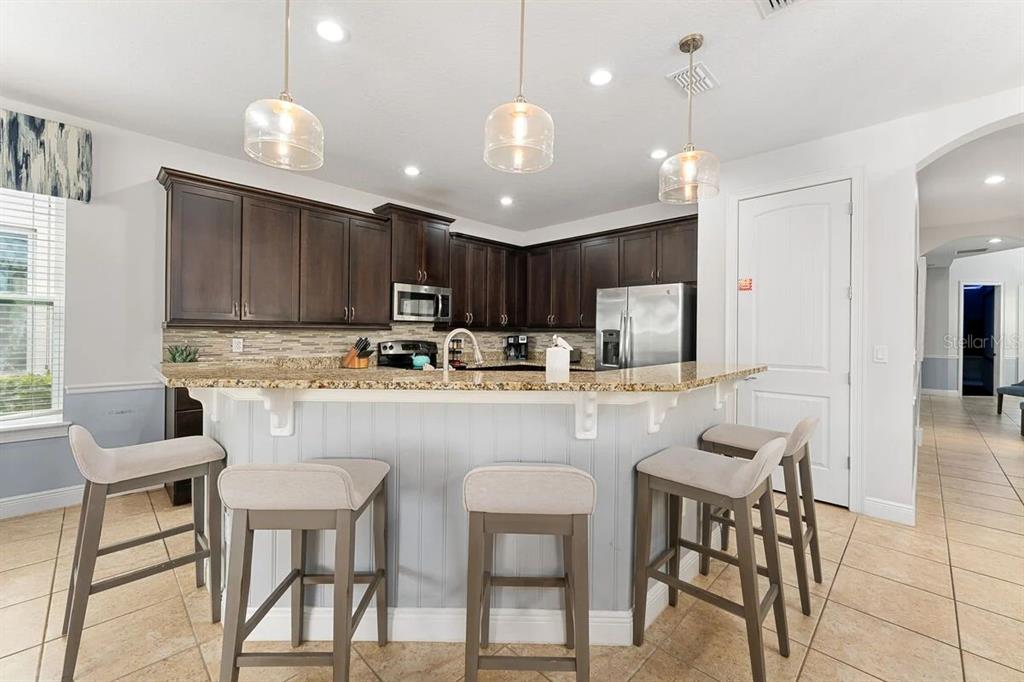 Gourmet Kitchen: Features solid wood cabinets, high-end stainless steel appliances, granite countertops, and a center island with a breakfast bar.