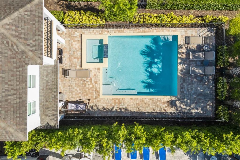 Heated Pool & Spa: A 21×17 heated gunite pool and bubbling spillover spa overlooking the lush pond and golf course views.