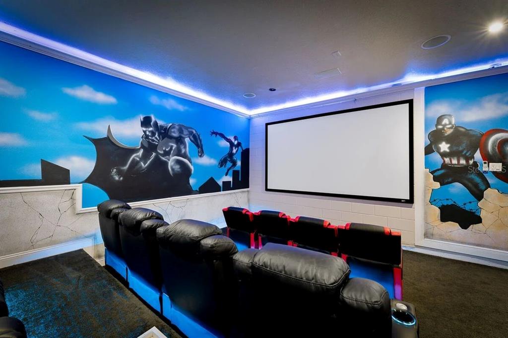 Private Home Theater: A fully air-conditioned, 9-seat theater with a massive 150″ projection screen.