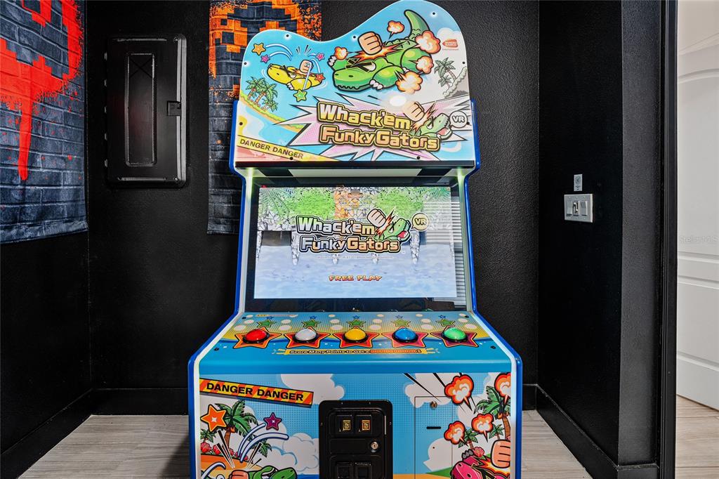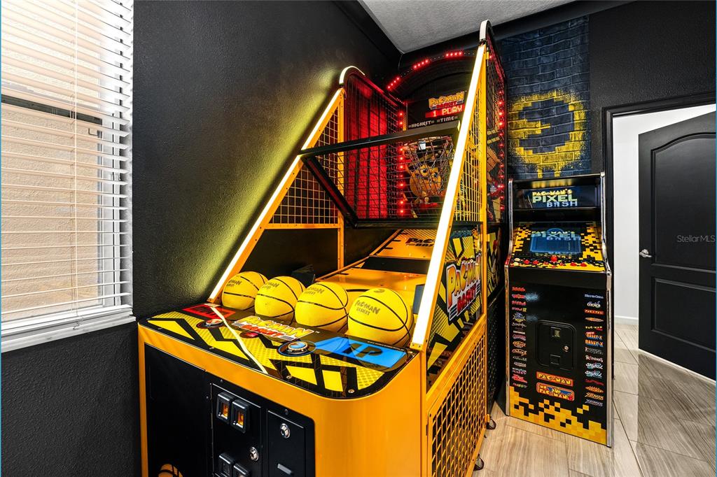 This home stands out with its impressive entertainment options. Enjoy a dedicated home theater with 10 reclining leather seats and a large projection screen—perfect for movie nights. The arcade room is equipped with popular games, while the upstairs game loft provides additional recreation, including a pool table, air hockey, karaoke system, and more.