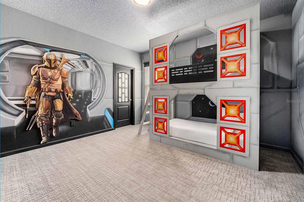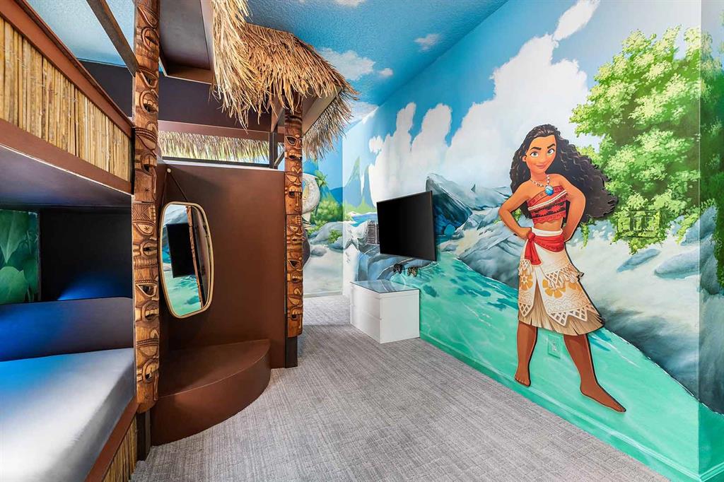 Two uniquely designed themed bedrooms elevate the experience, featuring a vibrant volcano-inspired room and an exciting space-themed retreat with custom décor and bunk beds—sure to delight younger guests.