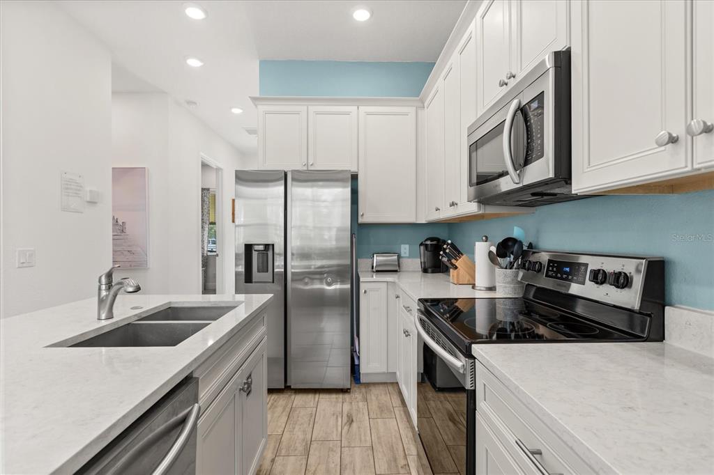 Inside, you’ll find a spacious open-concept layout with two bedroom suites on the first floor and additional guest rooms upstairs, including a luxurious second-floor primary suite with a private balcony. The gourmet kitchen features stainless steel appliances, modern cabinetry, and sleek countertops. The bright and inviting living space flows effortlessly to the private, fully fenced backyard oasis—complete with a sparkling in-ground pool, and open patio.