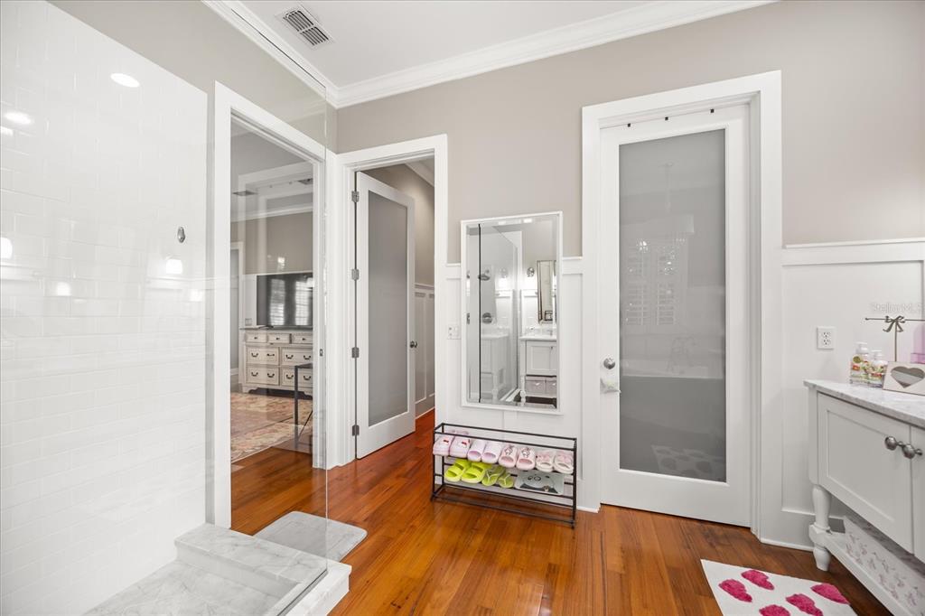 The first-floor primary suite is a true retreat with French doors to the backyard, wainscoting, crown molding, and a luxurious bathroom complete with freestanding soaking tub, marble-top dual vanities, seamless glass shower, and ample storage.