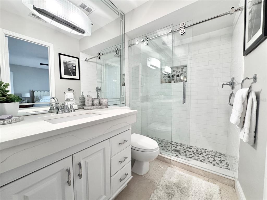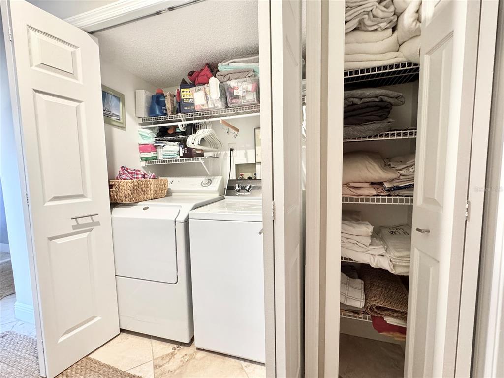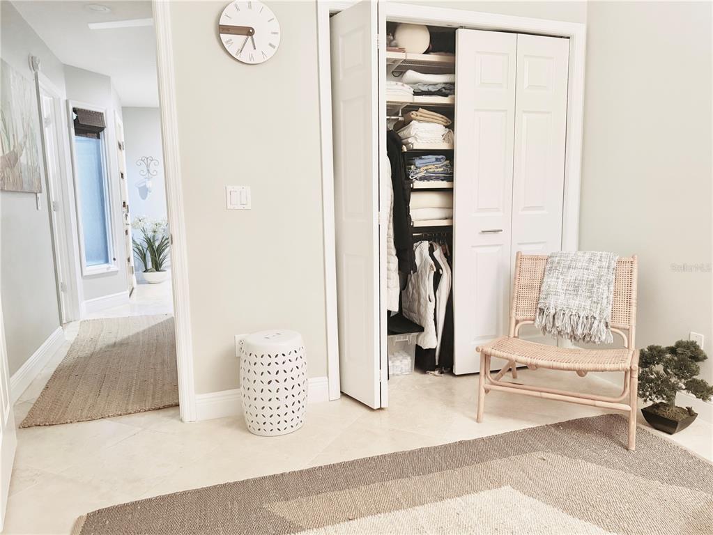 Guest bedrooms share a convenient Jack-and-Jill full bath featuring a rain shower, generous closets, and large windows that allow soft natural light to filter in. A centrally located laundry station provides space for large-capacity washer and dryer units, with an adjacent linen closet for added convenience. The foyer is enhanced by a deep coat closet and an additional guest powder room, making daily comings and goings effortless.