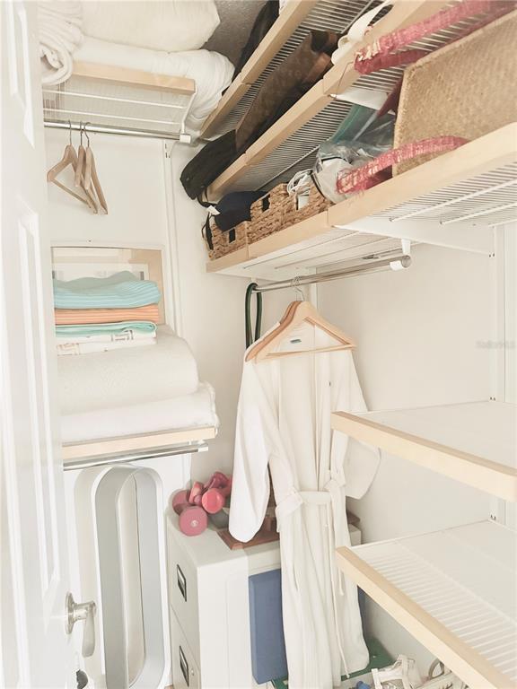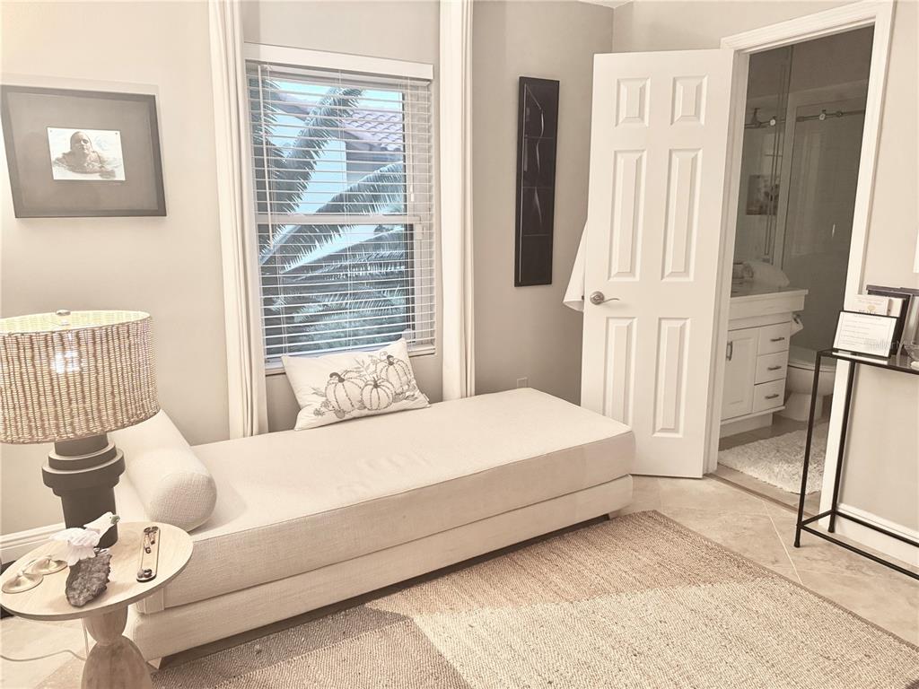 All closets throughout the home have been elevated with custom ELFA systems from The Container Store, reinforcing the home’s ergonomic, efficient, and elegant ease of living. The spacious primary suite easily accommodates a relaxing seating or reading area and opens directly onto the patio through sliding doors, seamlessly blending indoor and outdoor living.