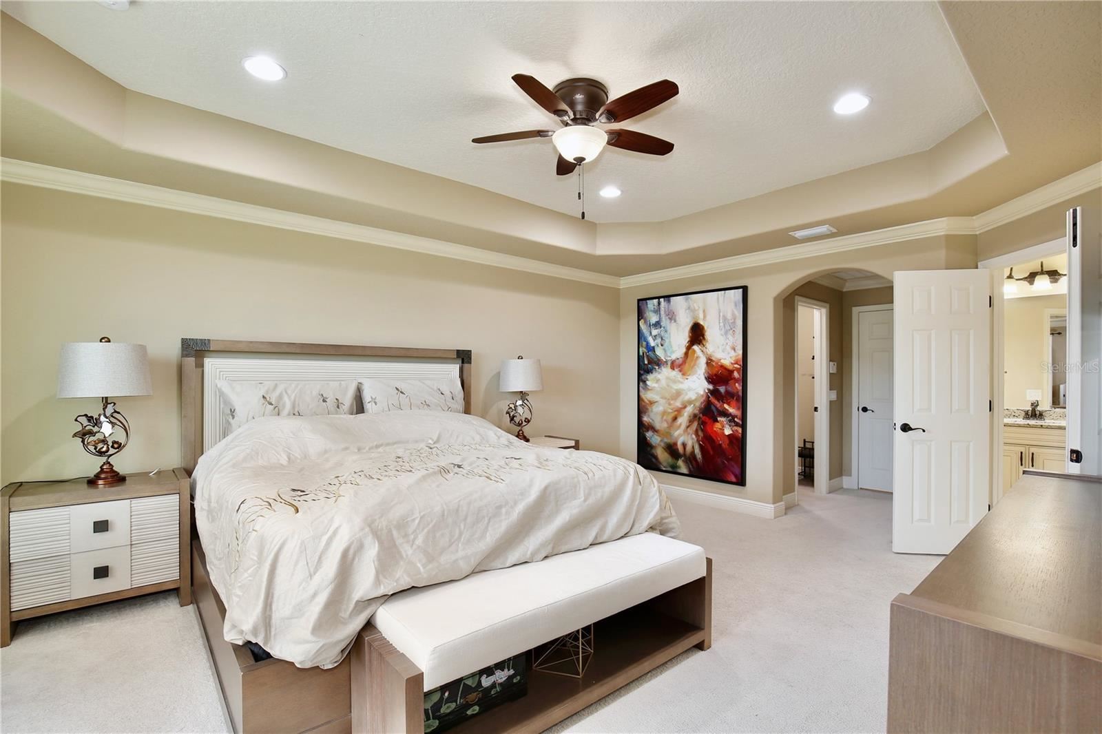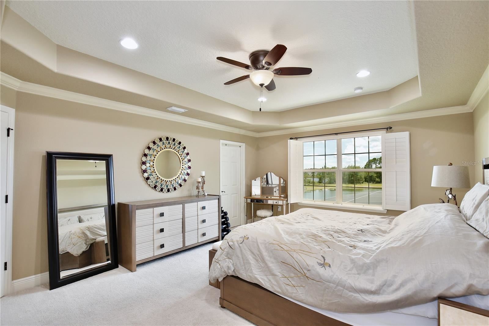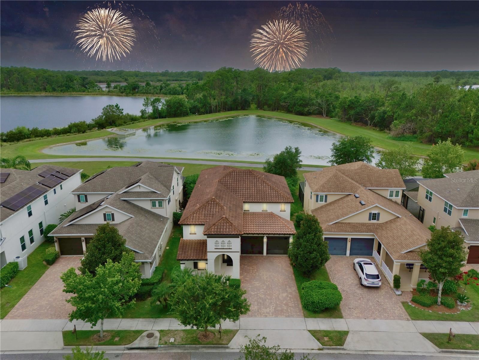 Experience the enchantment of a luxurious lifestyle with a home that offers elegance, comfort, and a touch of magic. Welcome to a stunning residence where every day feels like a vacation, with Disney World’s fireworks dazzling over the water view right in your backyard. This beautifully appointed Spanish style home boasts impressive curb appeal with its barrel tile roof, paver driveway, and a two car garage. As you approach, the covered front porch and landscaping adorned with palm trees invite you home. Inside, the home unfolds with a beautiful foyer featuring elegant tray ceilings, arched walkways, and neutral colors that set a serene tone. Entertain guests in the dining room, crowned by a chandelier and accented with plantation shutters over frosted privacy windows, and conduct business in the front office with its double door entry and crown molding. The living room and breakfast nook has tranquil water vistas, creating a relaxing atmosphere along with wood-style flooring and glass doors leading out to the lanai, featuring stone flooring and an opulent fountain. The lanai also has access to the living room’s half bath. The gourmet kitchen is a chef’s delight featuring shaker cabinets, stainless steel appliances, granite counters, a pantry closet, and bar top seating at the center island. Enjoy the convenience of a wine fridge and built in double ovens, while the bonus room with a double door entry provides additional space for your needs (currently utilized as a cake decorating room). Upstairs, awake to water views in the spacious primary suite with tray ceilings and two walk in closets. The sumptuous bath with dual sinks and a glass door shower provide a relaxing retreat. The giant bonus room (currently utilized as a bedroom) is ideal for a home theatre or game room. Two guest bedrooms share a Jack and Jill bath with dual vanities and a private tub/shower combo. The final bedroom conveniently sits alongside a well appointed bath with a glass door shower. The laundry room offers cabinet storage, a sink, and counter space for easy folding. Host unforgettable gatherings and barbecues on the outdoor patio, set against a backdrop of the stunning stone waterfall, water views, and the mesmerizing Disney fireworks. With a running track behind the home leading to the amenities, residents can enjoy access to a community pool with a splash pad and playground. Perfectly nestled between the Tibet-Butler Nature Preserve and Disney World, this location offers a blend of nature and wonder. Hit the putting green at nearby golf courses, enjoy quick convenience to nearby shopping and dining, and catch some thrills with close proximity to all the major theme parks. You’ll also be right near Bay Lake Elementary, Star Child Academy, hiking trails and butterfly gardens, making this a wonderfully serene location to settle down. View the 3D tour and schedule a showing to witness this dream home in person!
