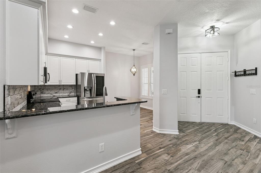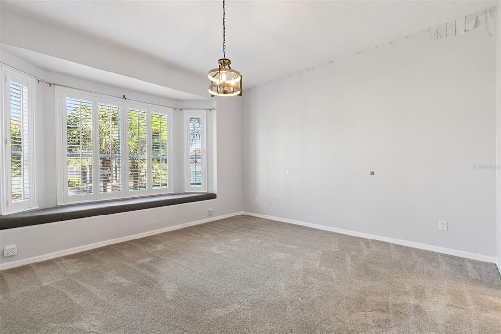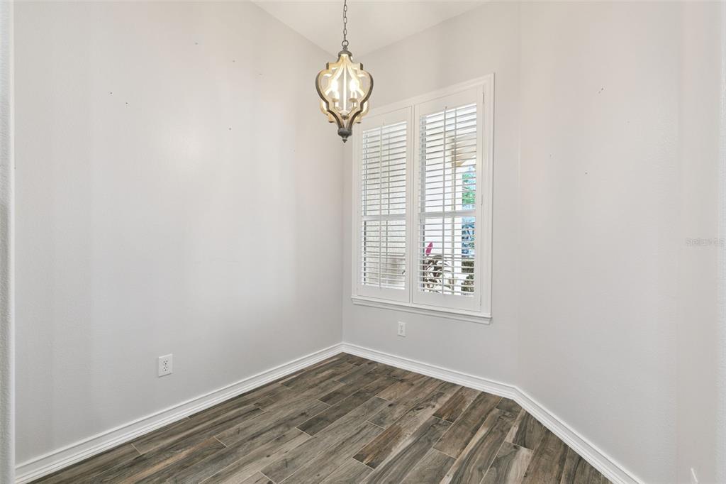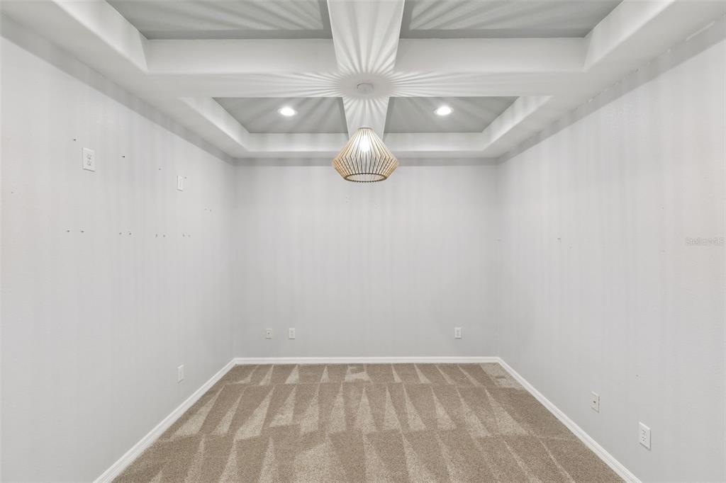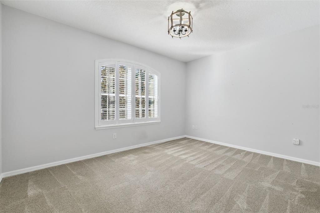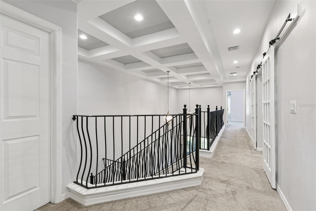 This 4-bedroom, 3 ½ bath home welcomes you with architectural details that create a dramatic first impression. Coffered ceilings, elegant wall molding and a striking wrought-iron staircase railing are just few of the elegant features. The upstairs landing overlooks the living and dining room below, enhancing the home’s open, light-filled design. Plantation shutters throughout add timeless style and privacy.