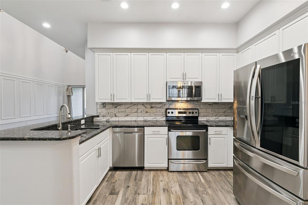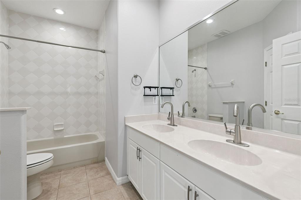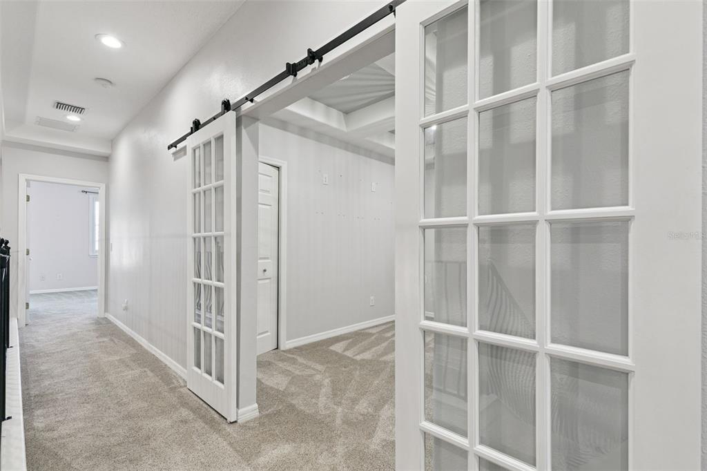 The kitchen is beautifully appointed with granite countertops, stainless steel appliances—perfect for entertaining or daily living. The primary suite is conveniently located on the first floor, offering a spacious bedroom with sitting area, window seating and plantation shutters, a walk-in closet, and a luxurious ensuite bath with double vanities, corner garden tub, and separate shower. Upstairs, a second master bedroom with private ensuite provides comfort and privacy, along with two additional generously sized bedrooms, perfect for family or guests. A private office with French-style barn doors is also located on the 2nd level and provides an ideal space for work or study.