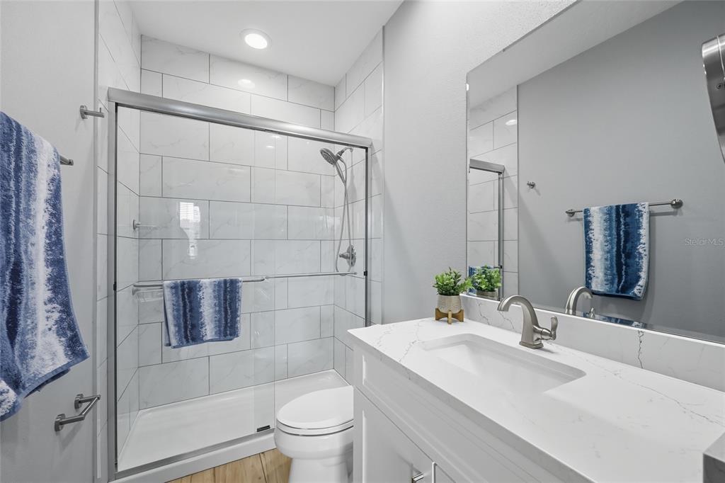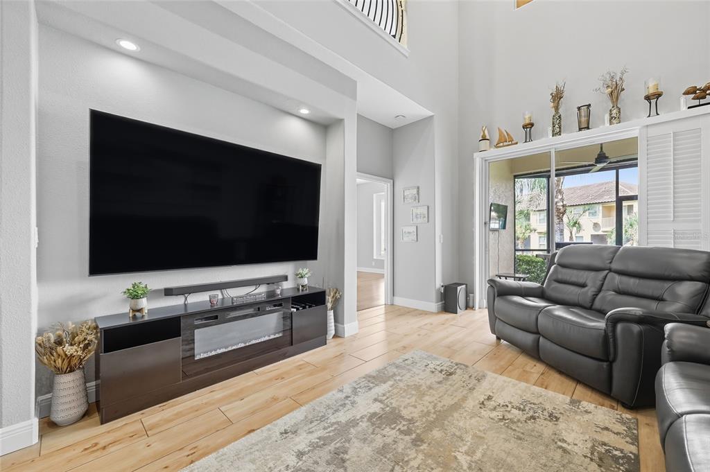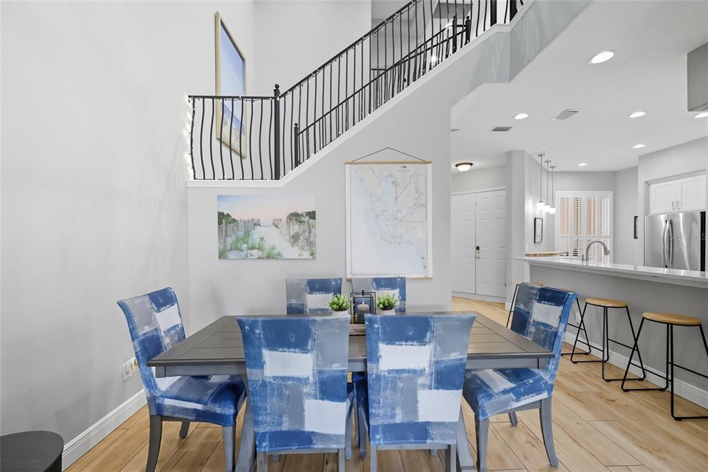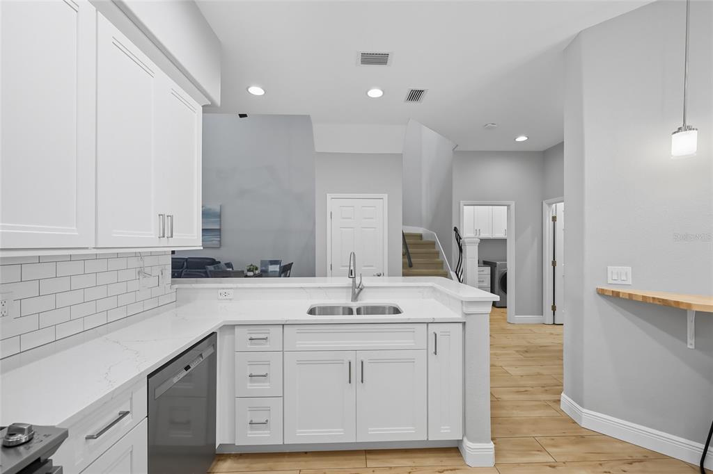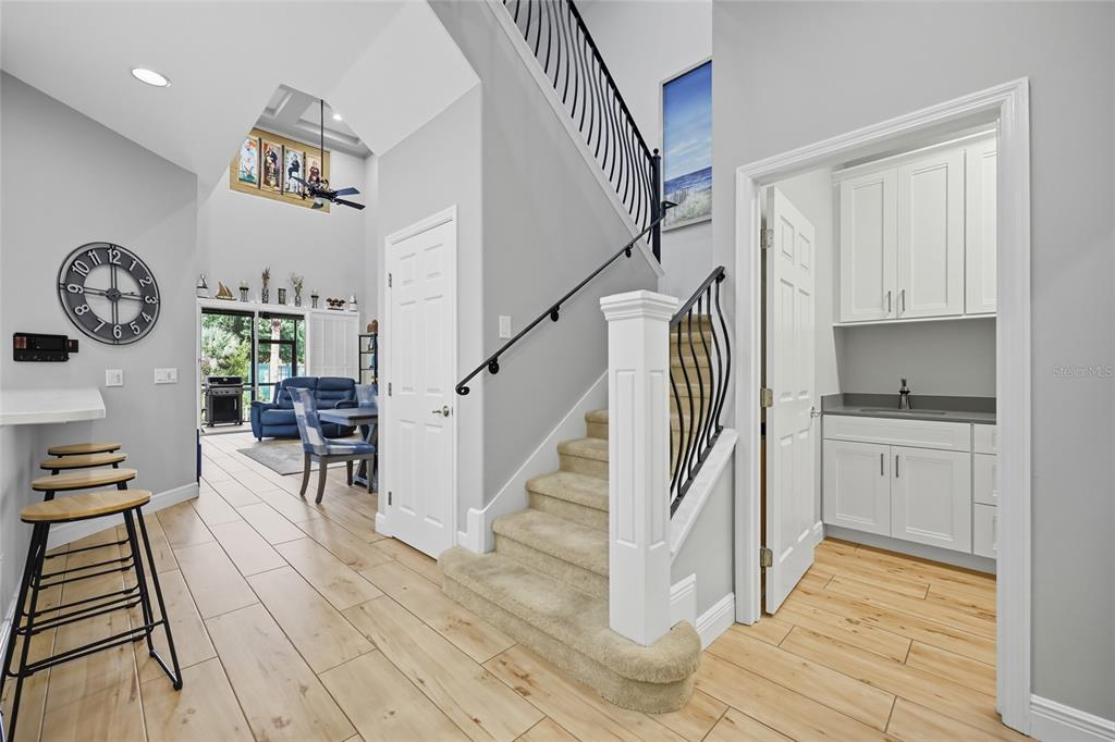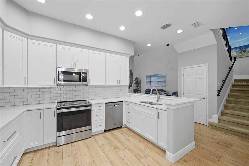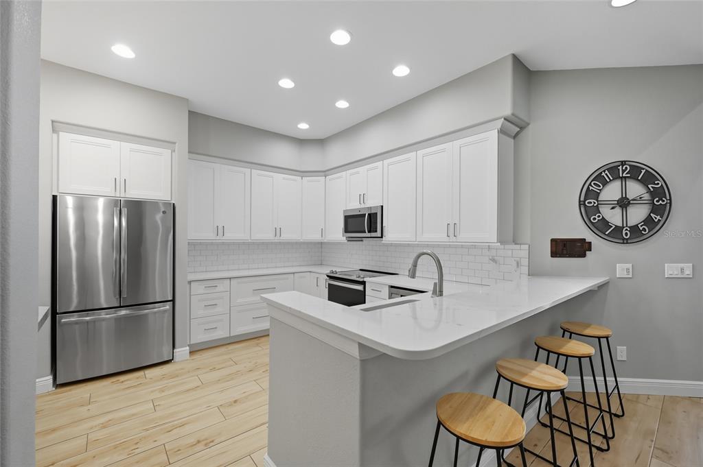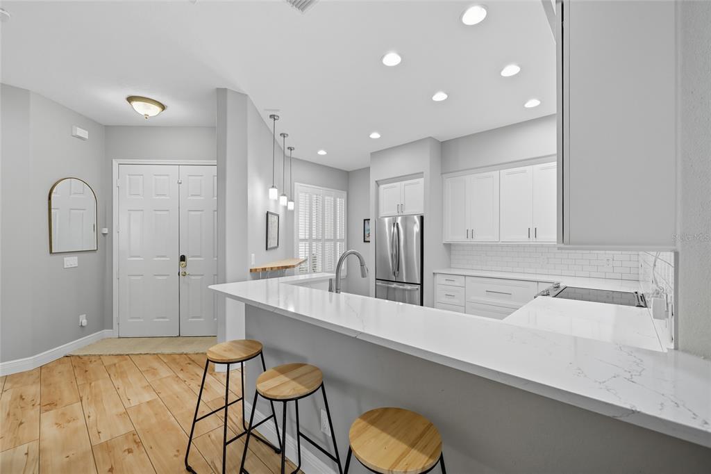 Step inside to an open floor plan with soaring ceilings, abundant natural light, and modern “wood-look” porcelain tile floors. The renovated kitchen features custom cabinetry, quartz countertops, subway tile backsplash, updated appliances, and a stylish butcher block breakfast bar. The dining and living areas flow seamlessly to the screened lanai—perfect for entertaining or enjoying a quiet morning coffee.