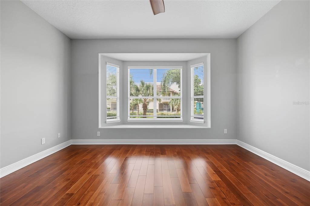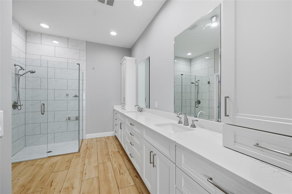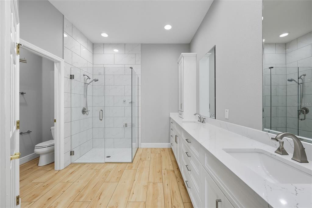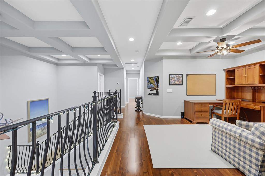 The main-floor primary suite offers wood flooring, a bay window with built-in seating, and a redesigned bath with a zero-entry shower, frameless glass, and marble-look tile. Upstairs, a second primary suite with en-suite bath, two additional bedrooms, a full bath, and a loft provide plenty of space and flexibility. Thoughtful details include custom wrought-iron railings, coffered ceilings, and consistent, curated finishes throughout.