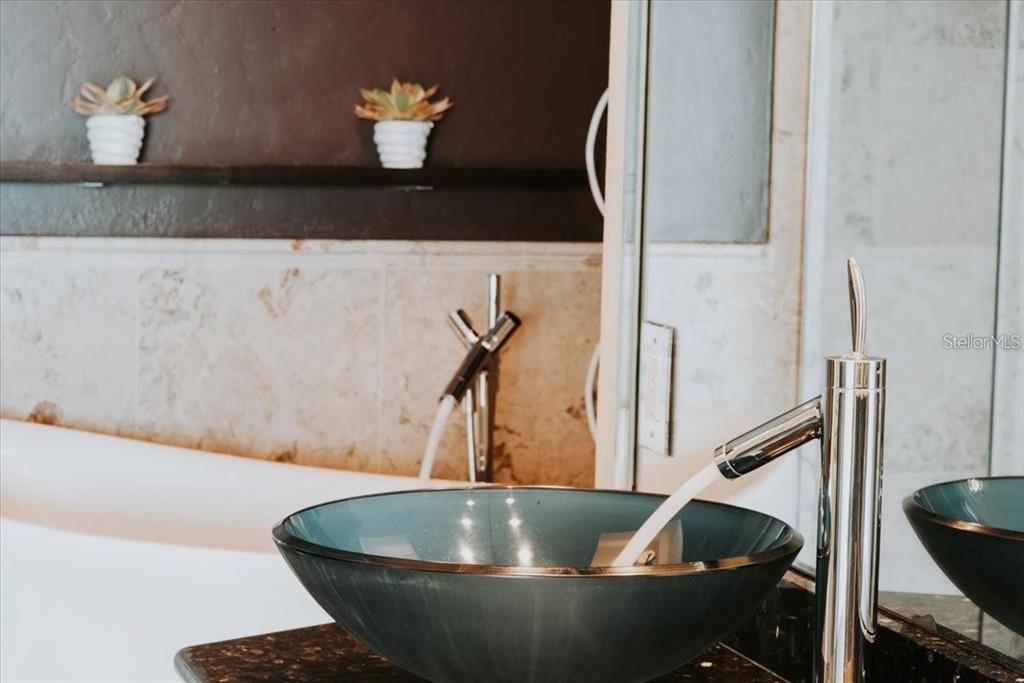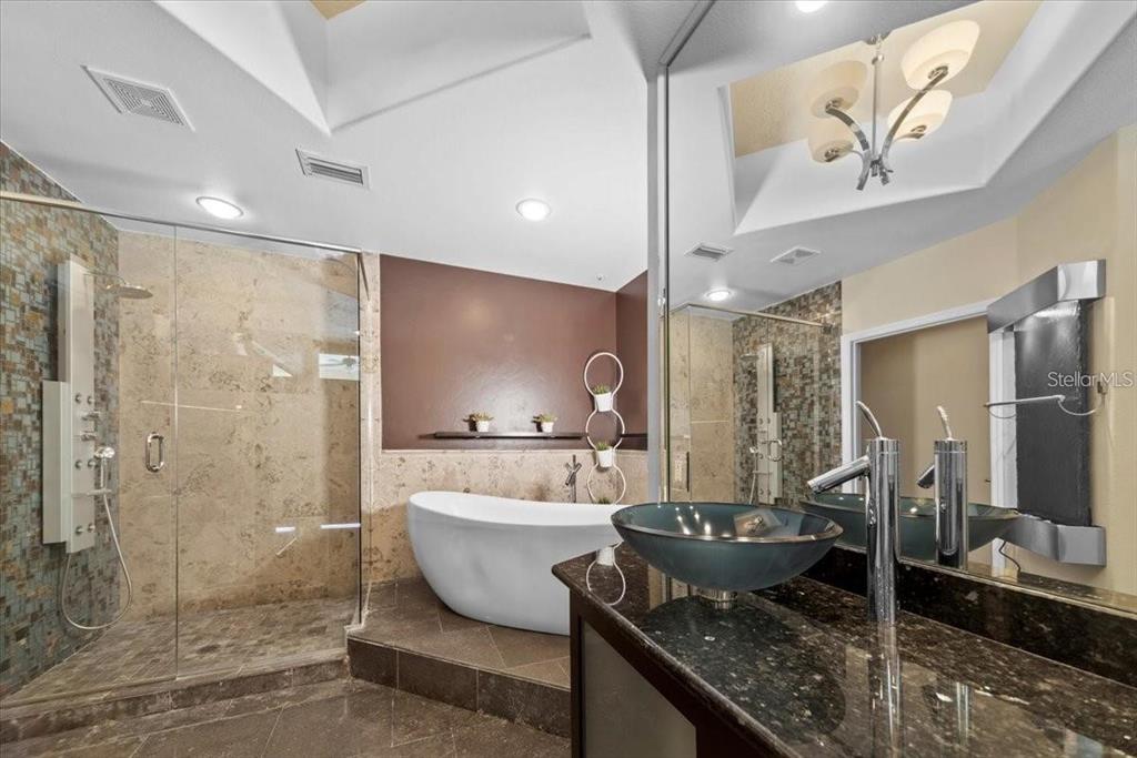 Completely upgraded with over $120,000 in designer finishes, this home blends contemporary luxury with timeless design. The primary suite features 600-year-old wood floors imported from China, a custom walk-in closet, and a spa-style bath with a freestanding Contura air tub, Hansgrohe fixtures, dual vessel sinks, body-jet shower system, and a dramatic wall fountain. The gourmet kitchen includes bamboo flooring (made in Germany), granite countertops, Thermador 75-bottle dual-zone wine cooler, Fisher & Paykel double-drawer dishwasher, and stunning stacked stone and glass mosaic backsplash.