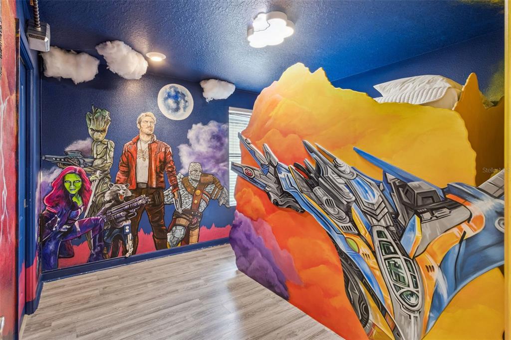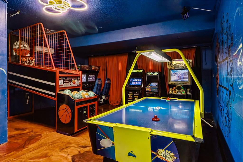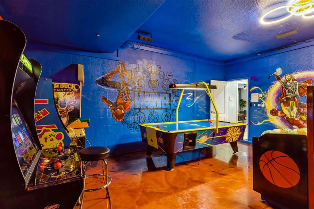 Entertainment is a true highlight. The high-energy, superhero-themed arcade room is enhanced with custom lighting, while the upstairs loft delivers the ultimate gaming experience with dual TVs, Xbox, and dedicated gaming chairs.