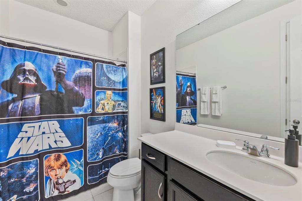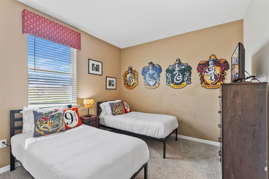 Sleeping arrangements include a mix of king suites, twin bedrooms, and a fun themed bunk room, ensuring everyone has a comfortable space to recharge. Kids will delight in the themed bedrooms that bring their favorite characters to life. Step outside to your private outdoor oasis featuring a pool, hot tub, and shaded al fresco dining area—ideal for enjoying Florida’s year-round sunshine and hosting BBQs or poolside fun.