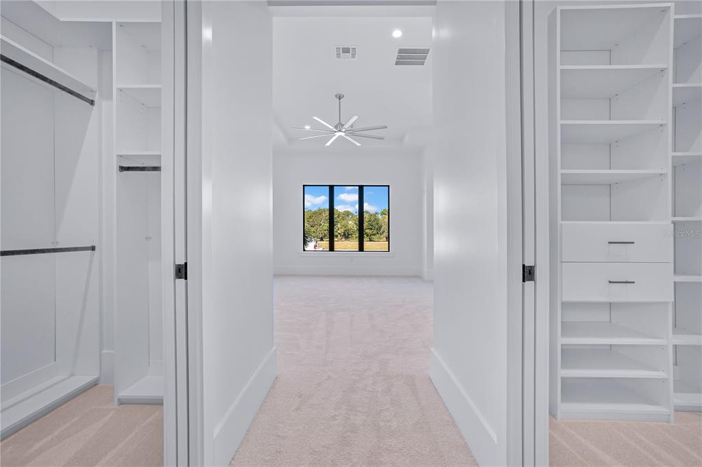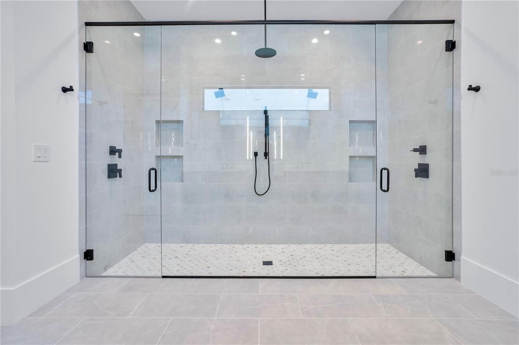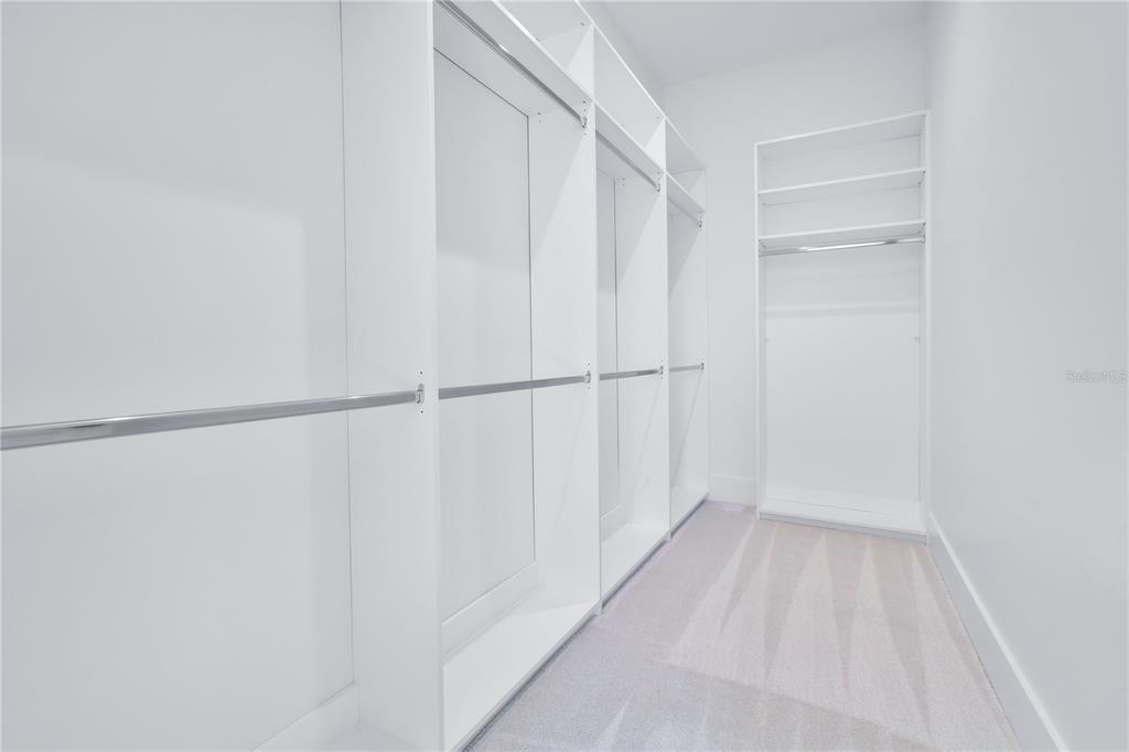 The main-level primary suite features a sitting area, an oversized tiled walk-in shower with dual shower heads, and two custom walk-in closets with built-in cabinetry. A first-floor guest suite with private bath adds flexibility. Additional bedrooms include walk-in closets with custom built-in systems.