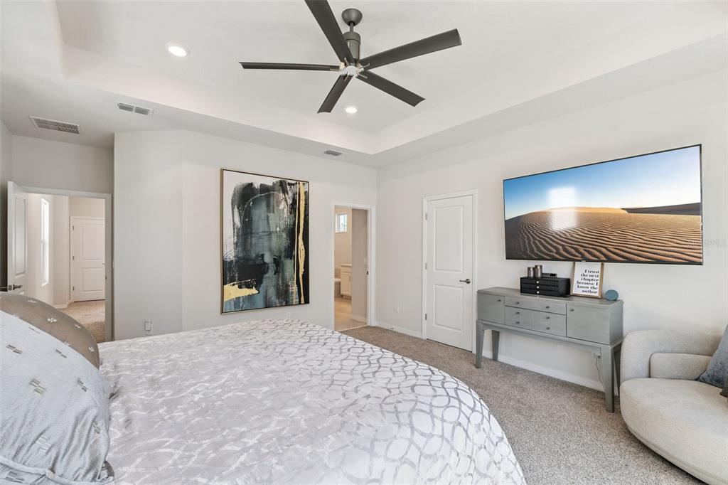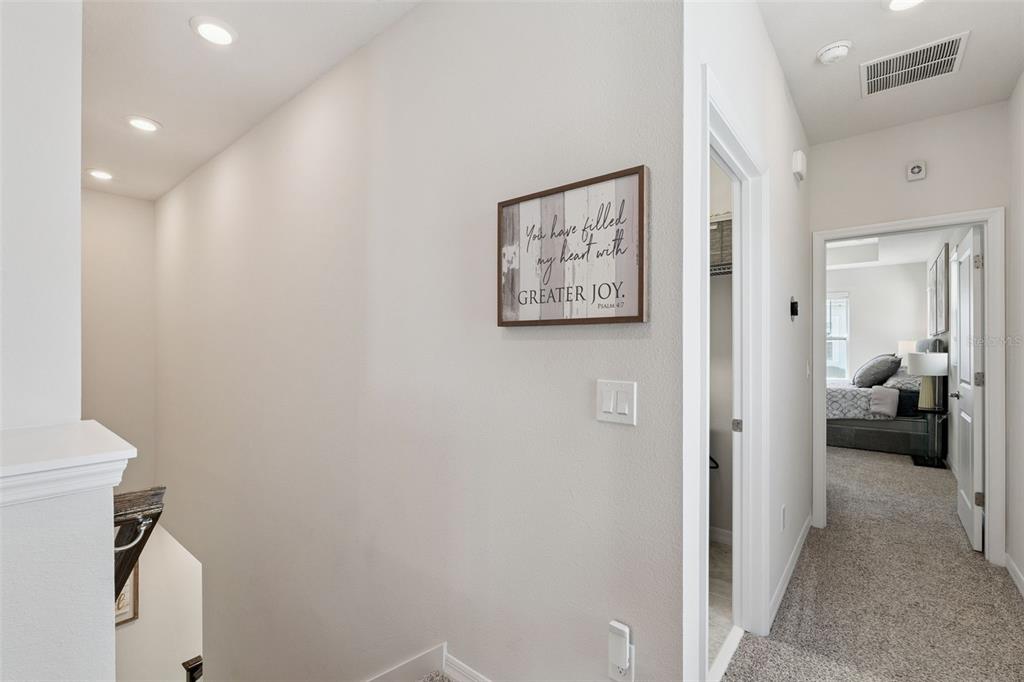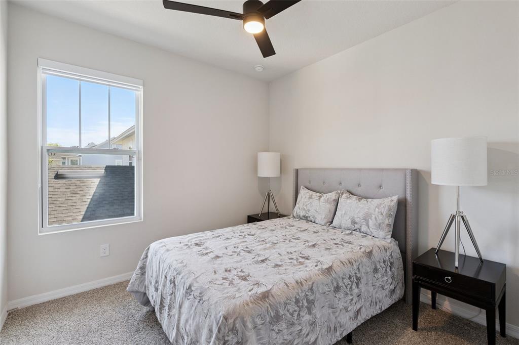 Upstairs, all three bedrooms including the primary suite are grouped together, creating a quieter, more private living area away from the main floor. The primary suite includes a walk-in closet, double vanity, and a tiled shower. A shared full bathroom serves the two additional bedrooms. The upstairs laundry room with washer and dryer included keeps the daily routine on one level. Carpeted bedrooms and ceiling fans throughout add comfort.