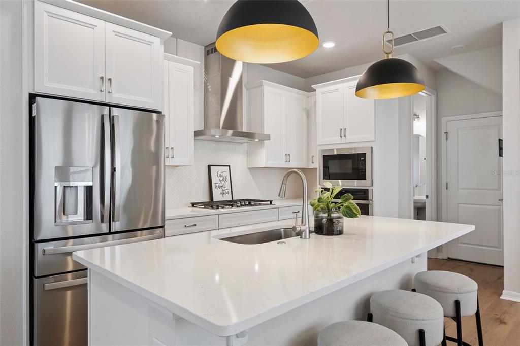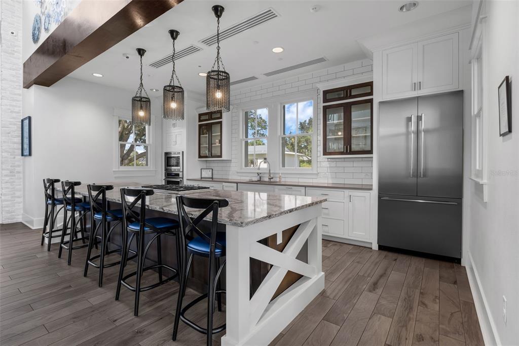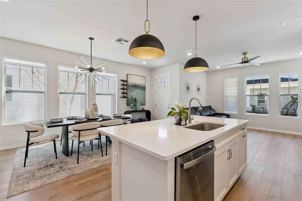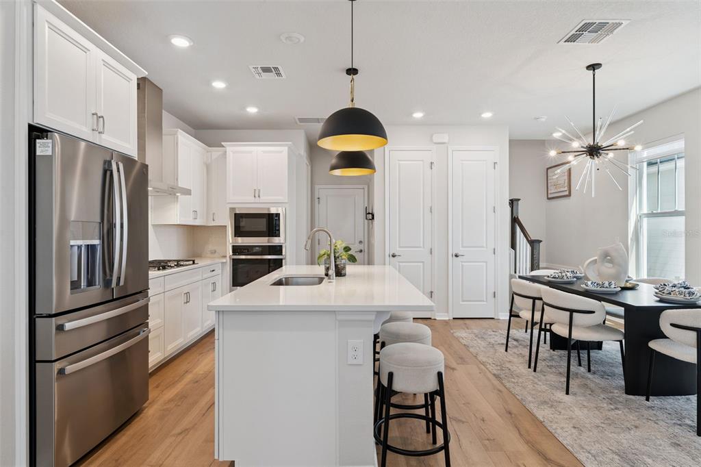 The kitchen features white shaker cabinets, quartz countertops, a kitchen island with bar seating, black pendant lighting, and stainless steel appliances including a refrigerator, range, built-in oven, microwave, and dishwasher. The open dining area sits adjacent with a sputnik-style chandelier and large windows filling the space with natural light. Hardwood-style flooring runs through the main level.